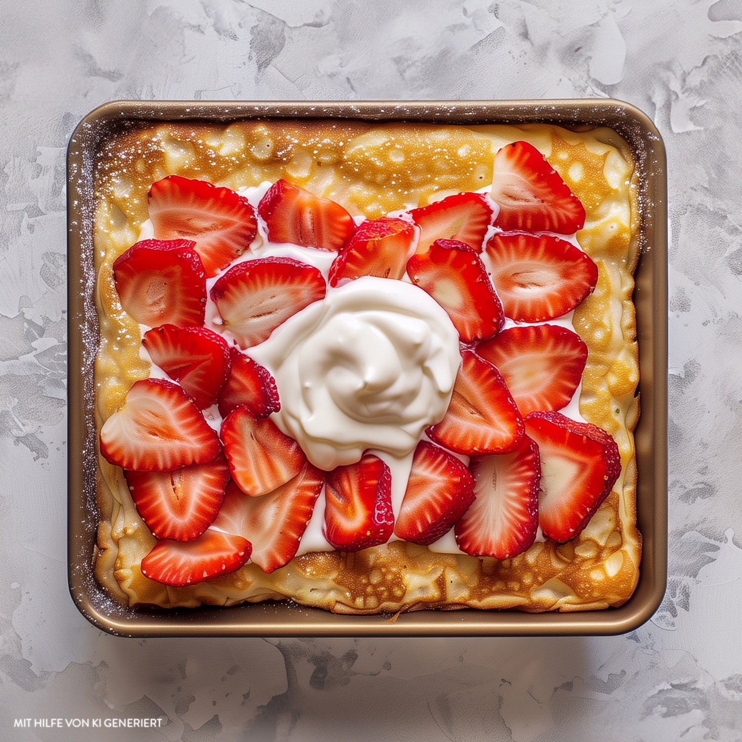 - Den fertig gebackenen Pfannkuchen aus dem Ofen nehmen, leicht abkühlen lassen und in Stücke schneiden. Mit den Erdbeeren belegen und die geschlagene Sahne in der Mitte verteilen. Optional mit etwas Puderzucker bestäuben und servieren.