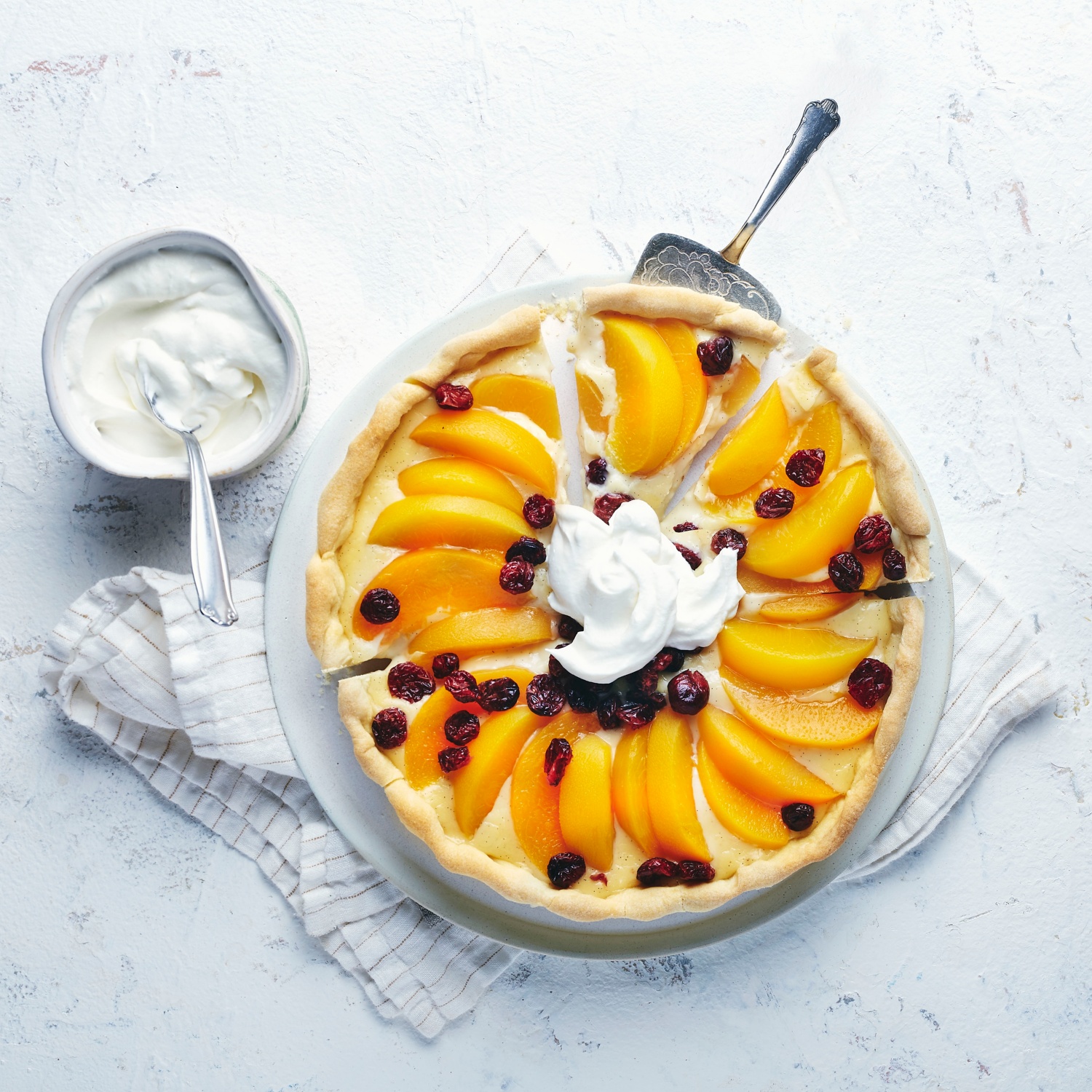 - Die Mascarpone-Creme gleichmäßig auf der abgekühlten Tarte verteilen und mit den Pfirischscheiben belegen. Die Cranberries darüber streuen.