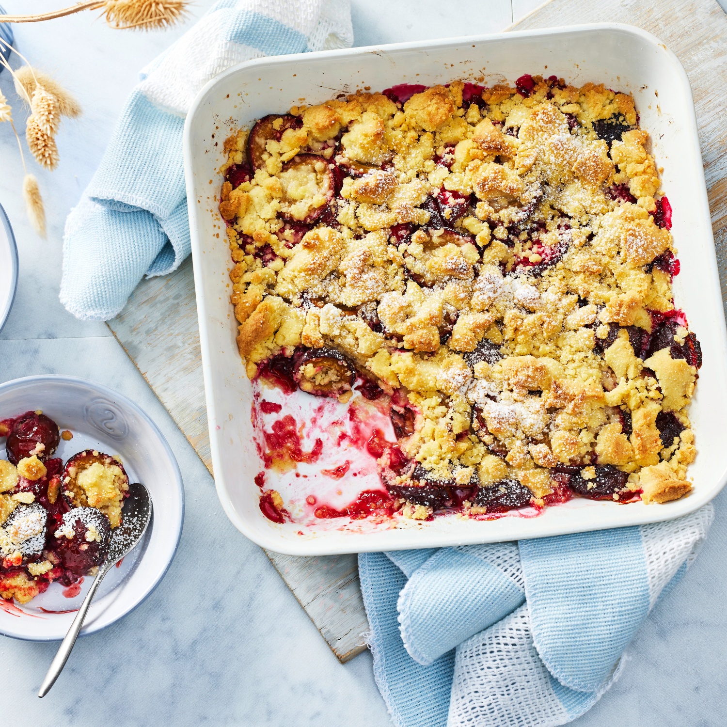 - Pflaumen-Crumble im vorgeheizten Backofen (E-Herd: 200 °C / Umluft: 180 °C) 30-40 Minuten backen. Pflaumen-Crumble etwas abkühlen lassen und nach Belieben mit Puderzucker bestäuben.