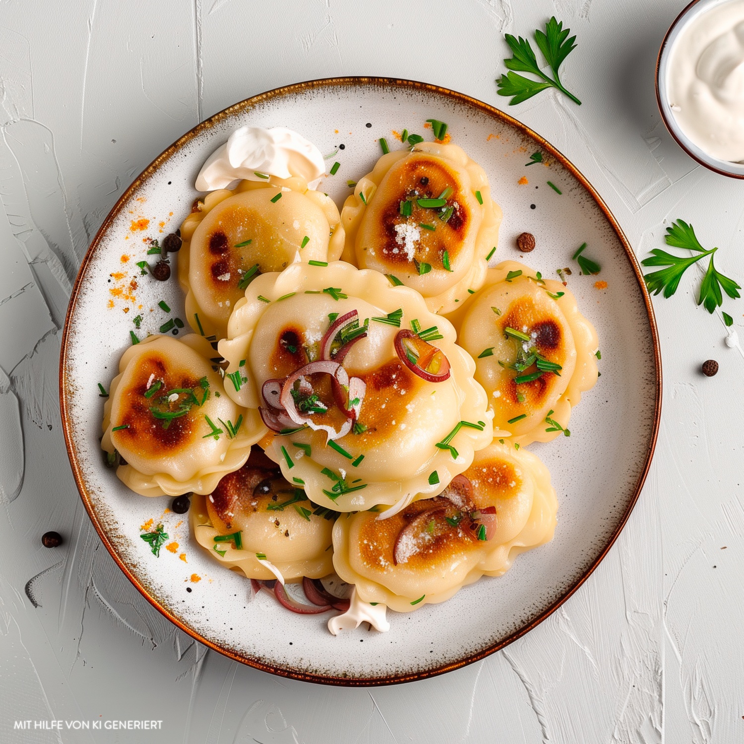 - Die Pierogi nach Belieben mit roten, leicht gedünsteten Zwiebelringen, saurer Sahne und gehacktem Schnittlauch garnieren.