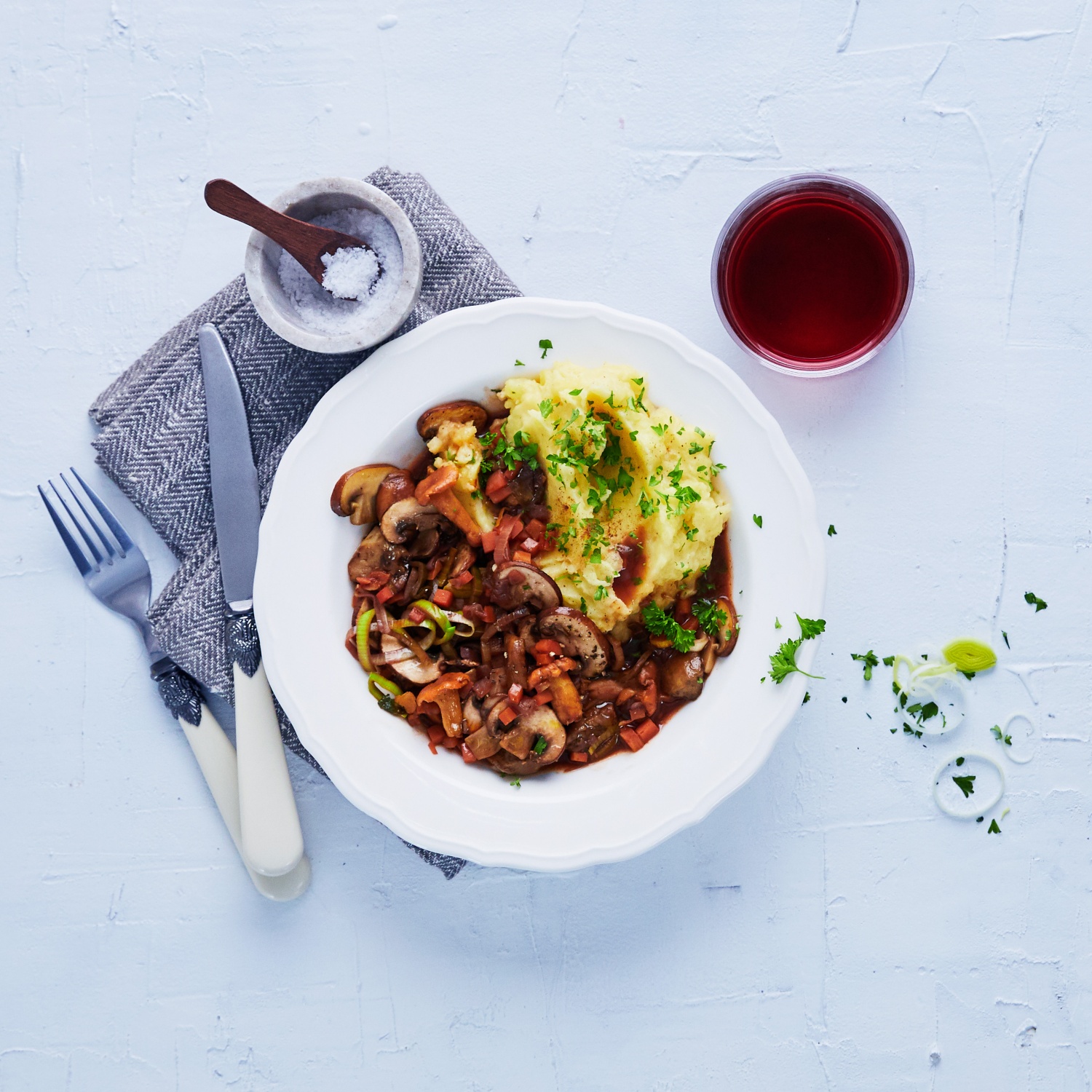 Französisches Gulasch für alle die gerne vegetarisch essen. Das Pilz Bourguignon mit Kartoffelstampf ist eine würzig-cremige Verführung. Zum Rezept