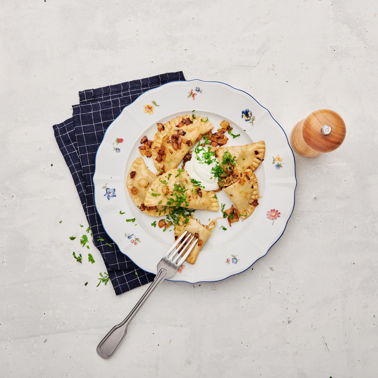 - Die Piroggen zu den Zwiebeln in die Pfanne geben, kurz schwenken und anschließend mit etwas saurer Sahne und der restlichen Petersilie servieren.