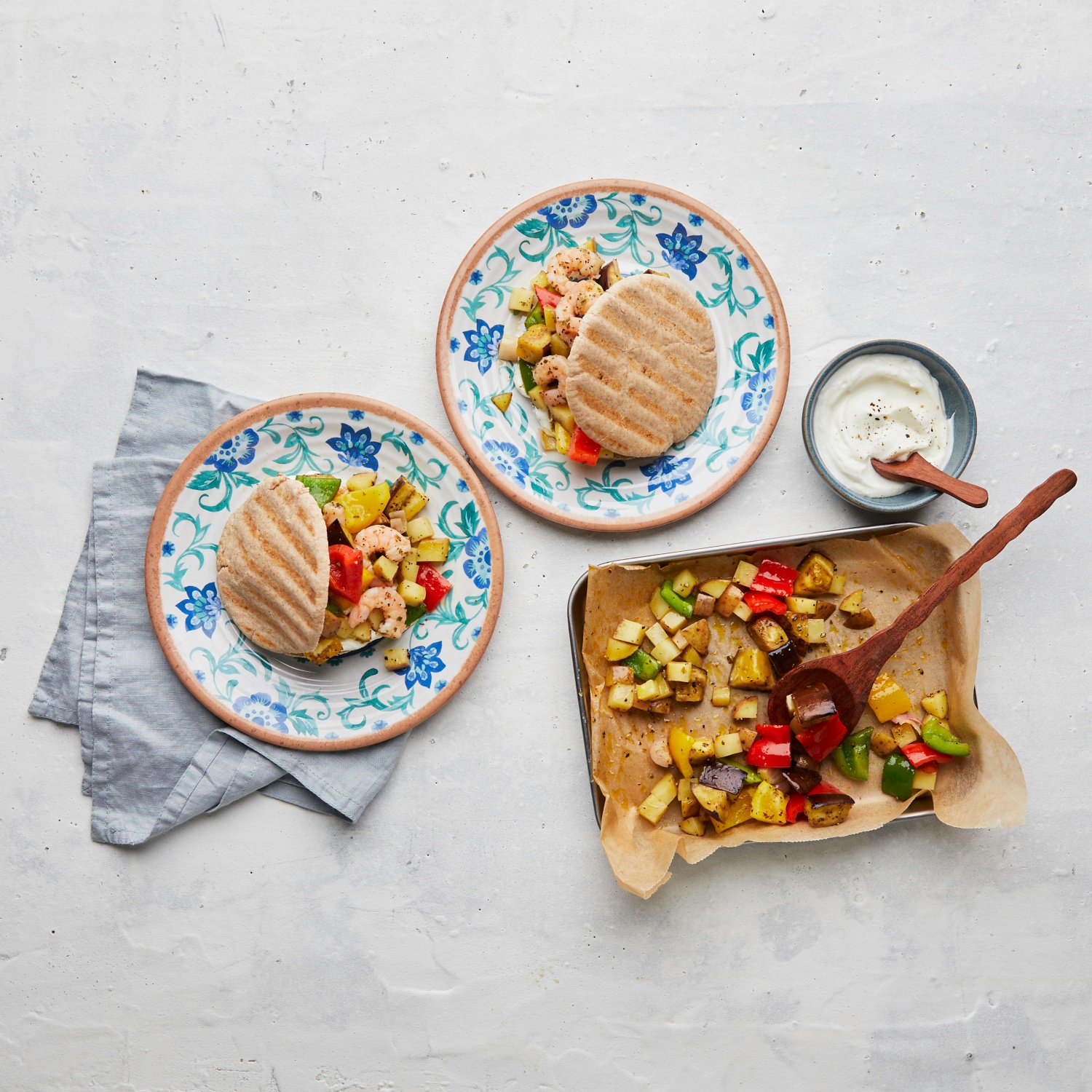 Marinierte Garnelen und mediterranes Gemüse dem Backofen im rustikalen Pita-Brot: So schmeckt das Mittelmeer. Zum Rezept