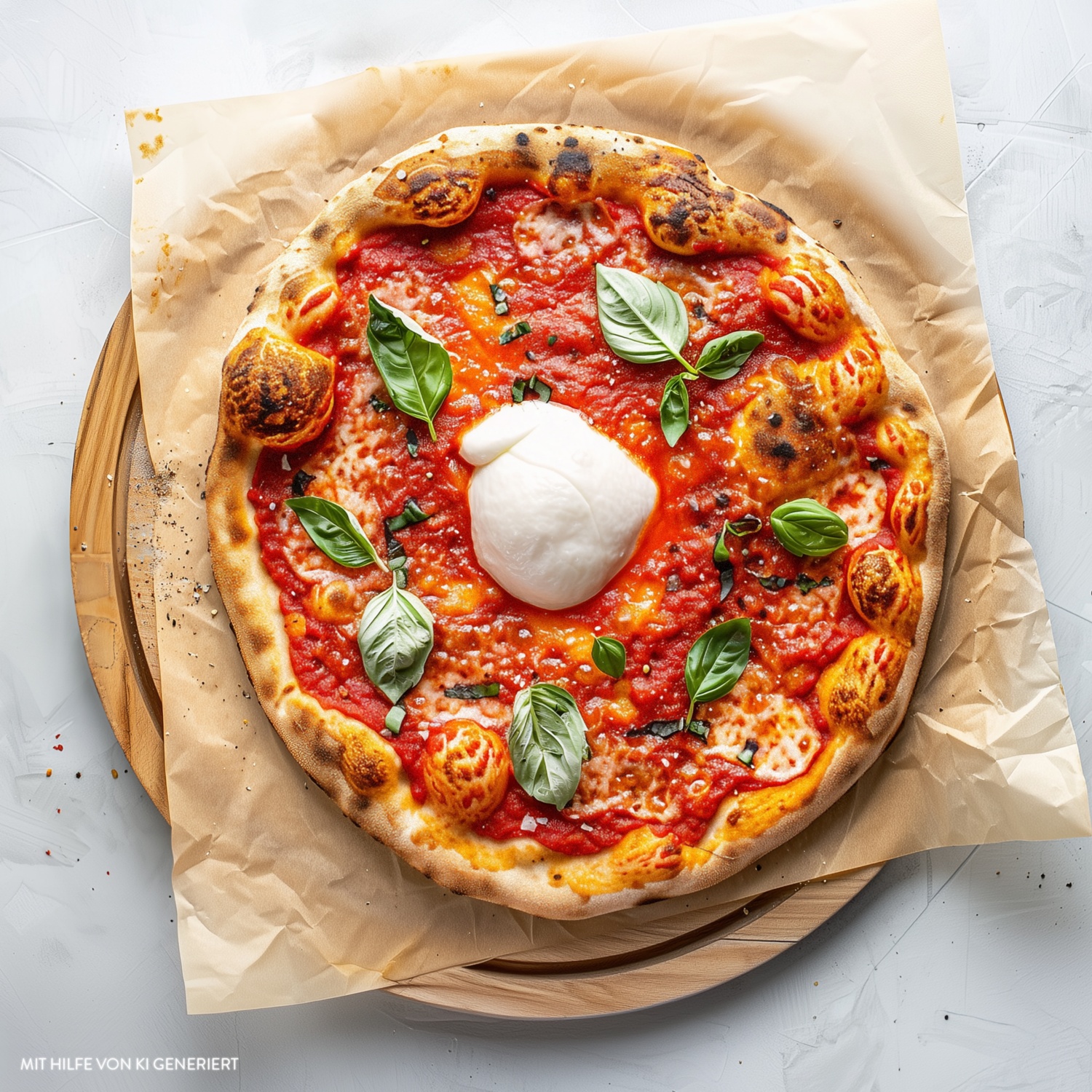 - Auf die Pizzen nach dem Backen oder in den letzten 2– Minuten Backzeit je 1 Kugel Büffelmozzarella geben. Mit Basilikumblättern garniert servieren.