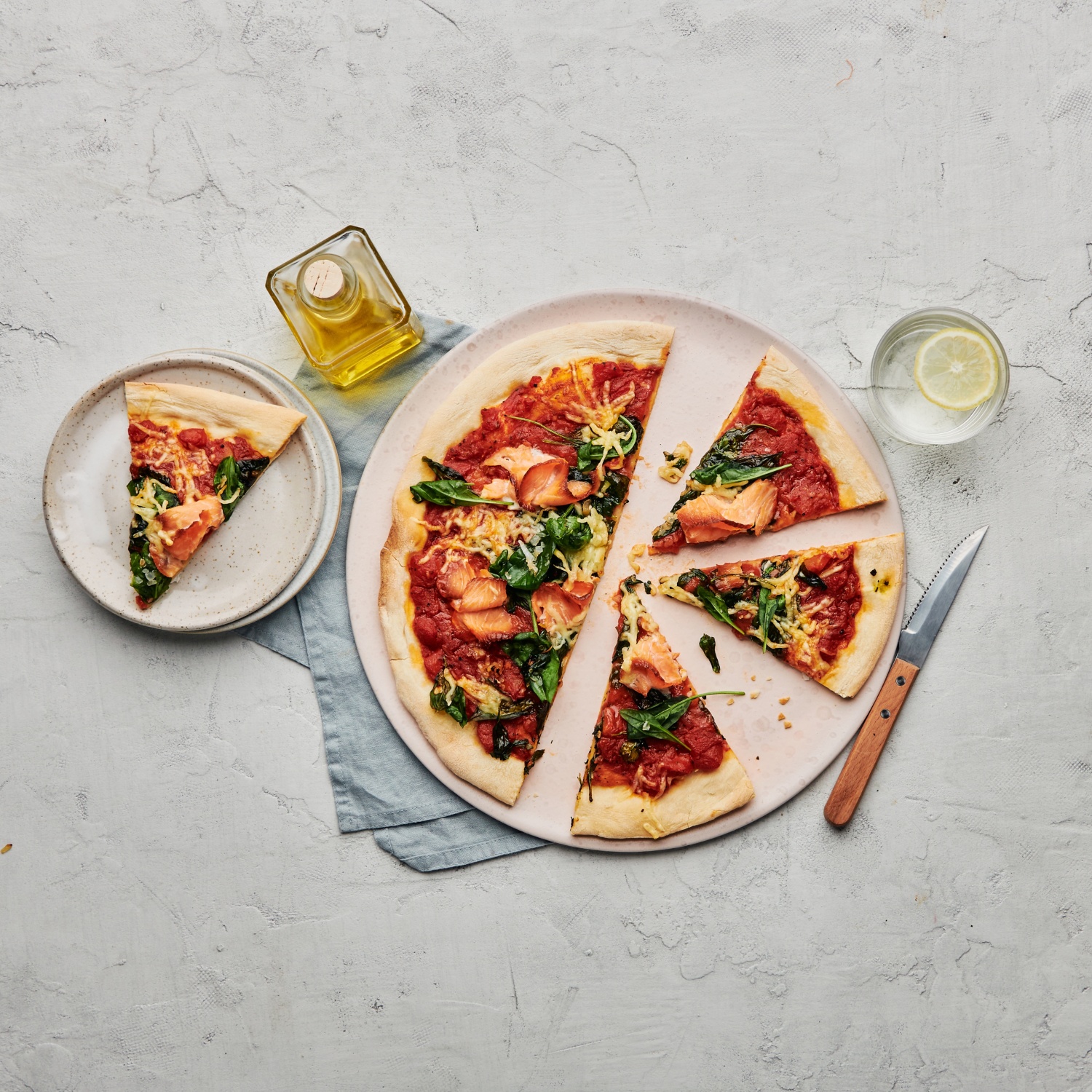 - Den Teig ausrollen und auf ein mit Backpapier belegtes Blech oder 2 runde, gefettete Pizzableche legen. Mit der Tomatensauce bestreichen und mit dem Spinat, dem Räucherlachs und dem geriebenen Käse belegen. Die Pizza im vorgeheizten Ofen je nach Teigdicke bei 250 °C Umluft (270 °C Ober- und Unterhitze) 7–12 Minuten backen.