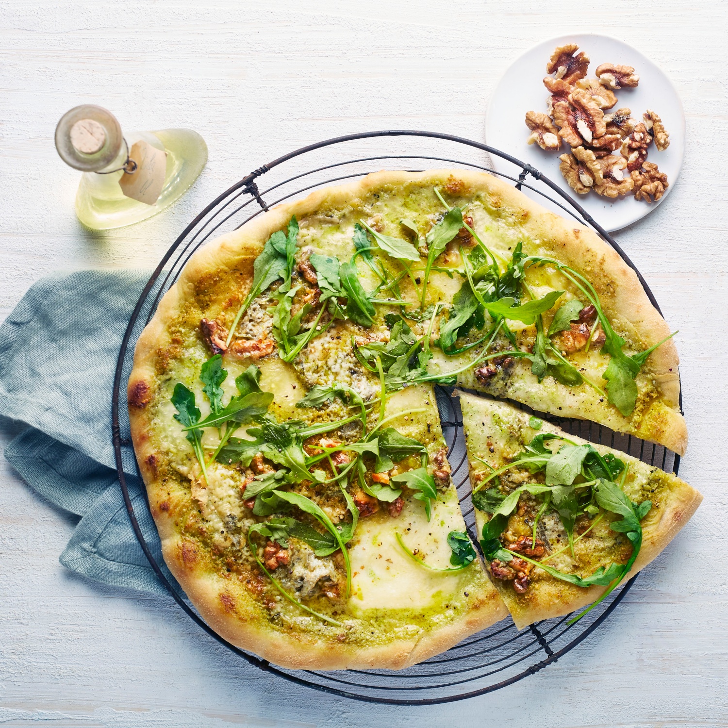 Vegetarische Pizza Verde mit grünem Pesto, zwei verschiedenen Käsesorten und knackigen Walnüssen – so hast du Pizza noch nicht erlebt! Zum Rezept