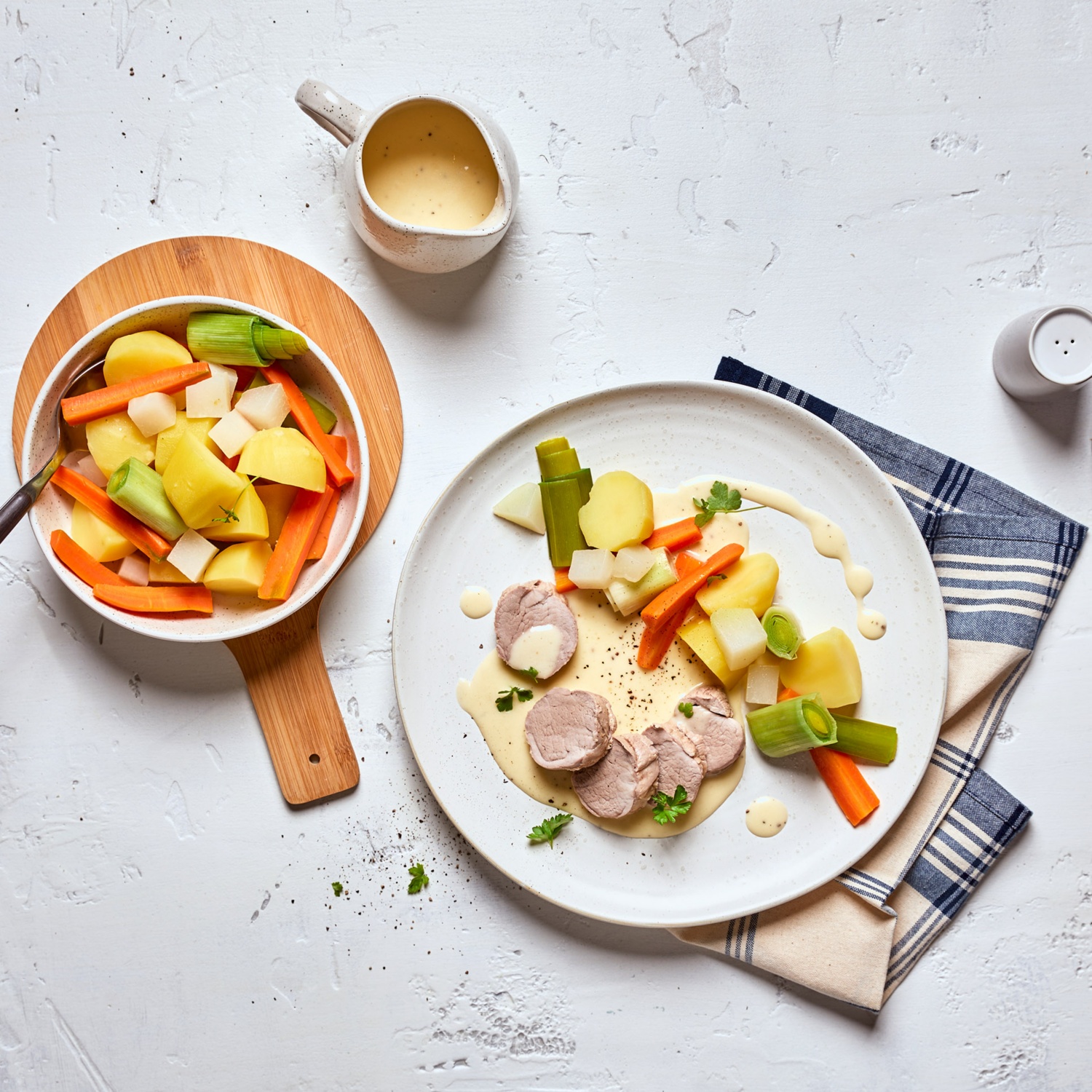 Pochiertes Schweinefilet mit Bouillon-Gemüse und Meerrettich-Rahm