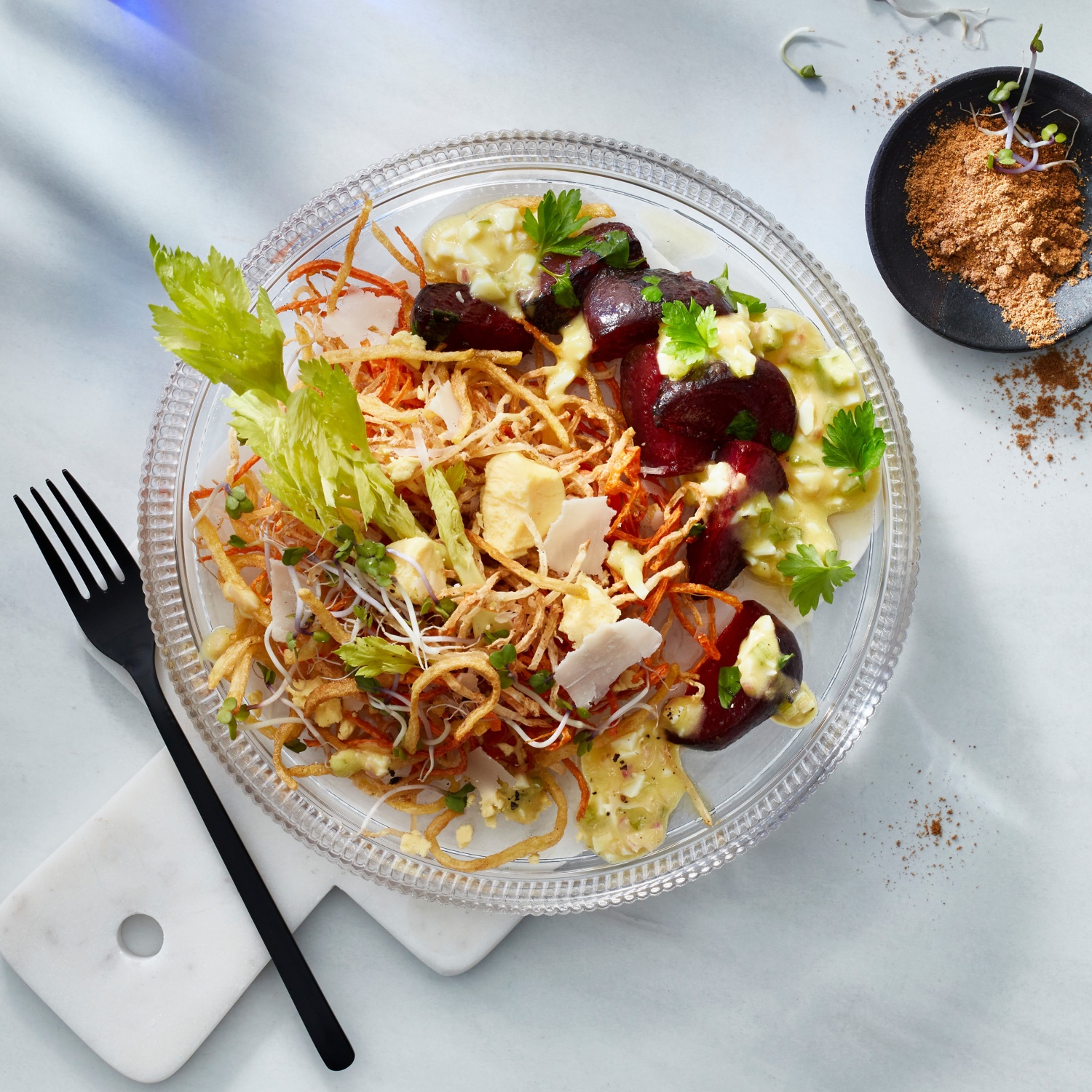 - Die Pommes mit dem Rote-Bete-Salat anrichten. Die Sprossen und das Selleriegrün darübergeben. Das Eigelb zerbröseln und ebenfalls über das Gemüse geben. Alles mit der Vinaigrette beträufeln und servieren.
