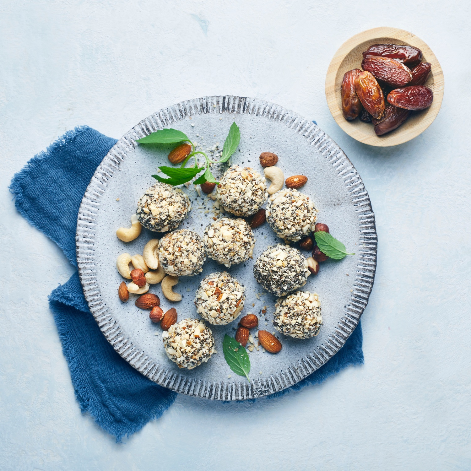 - Den Teig mit den Händen zu kleinen Kugeln formen, in den Nüssen rundherum wälzen und servieren.