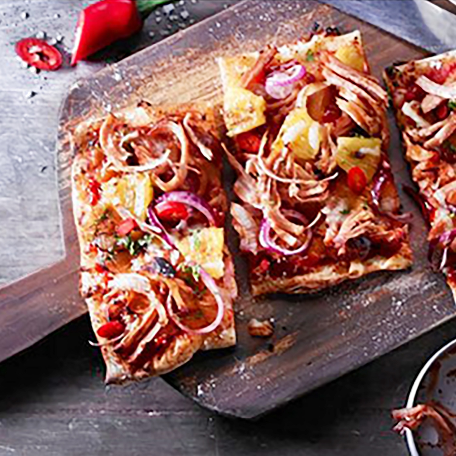 3. Den Backofen auf 200 °C Umluft (220 °C Ober-/Unterhitze) vorheizen. Den Pizzateig auf einer bemehlten Fläche dünn ausrollen, auf ein mit Backpapier belegtes Blech geben und mit der Pizzasauce bestreichen. Mit dem Käse bestreuen und nach Belieben mit dem Pulled Turkey, Ananas und roten Zwiebel belegen. Mit etwas fein gehackter Chilischote oder Chilisalz verfeinern und etwa 15-20 Minuten auf der untersten Schiene knusprig ausbacken.