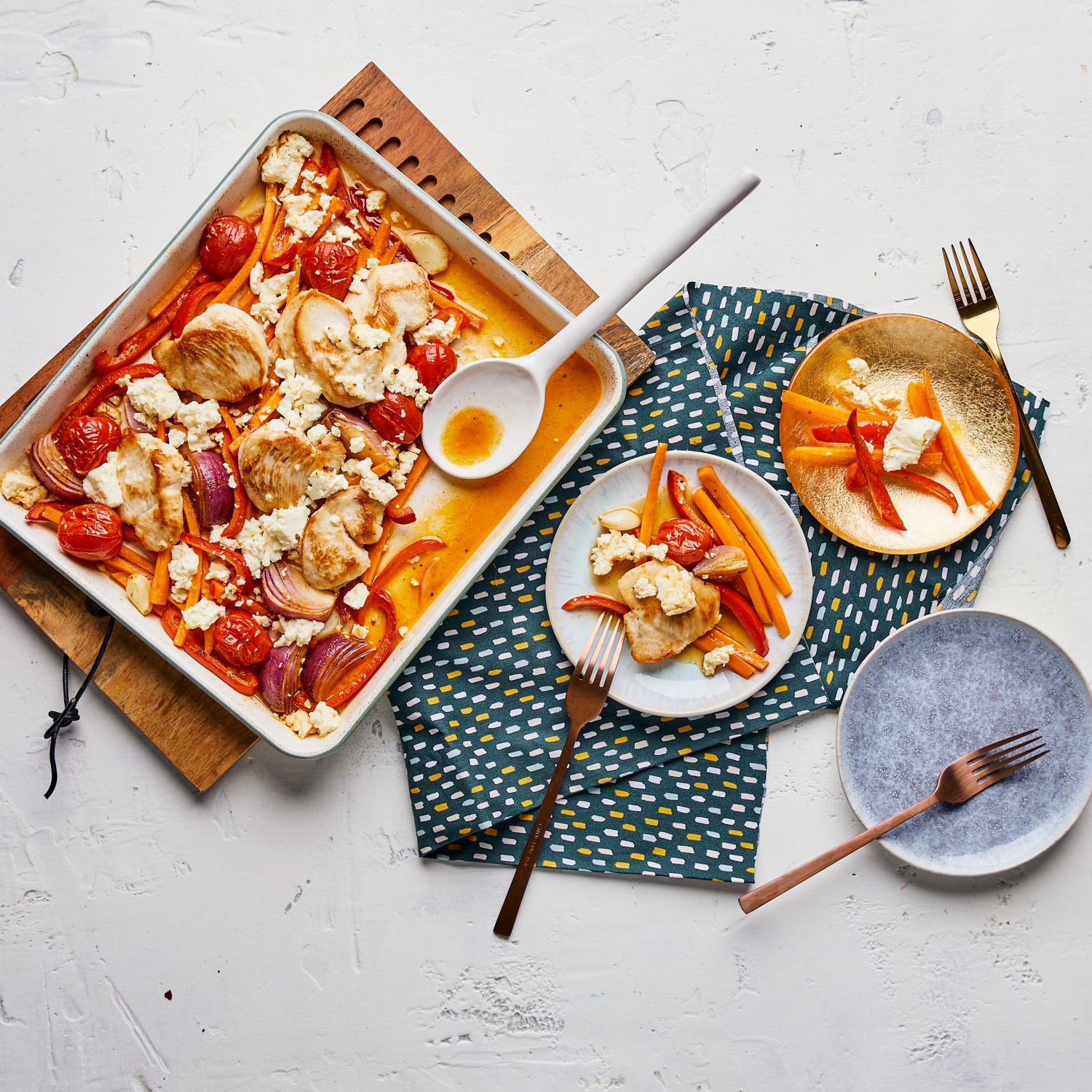 5. Die Steaks auf das Gemüse legen. Alles mit zerkrümeltem Feta bestreuen.