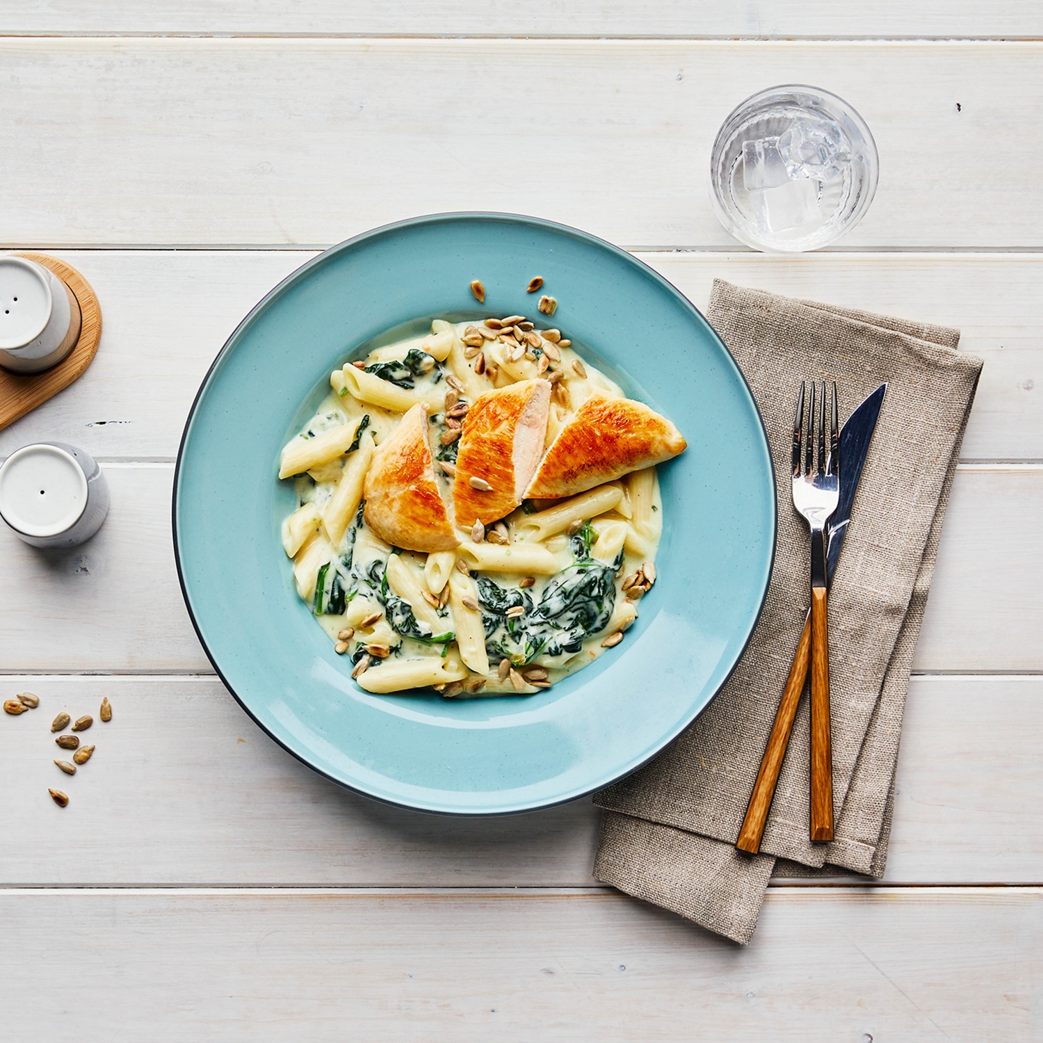 - Die Nudeln und die Putenfilets auf Tellern anrichten und mit den Sonnenblumenkernen bestreut servieren.