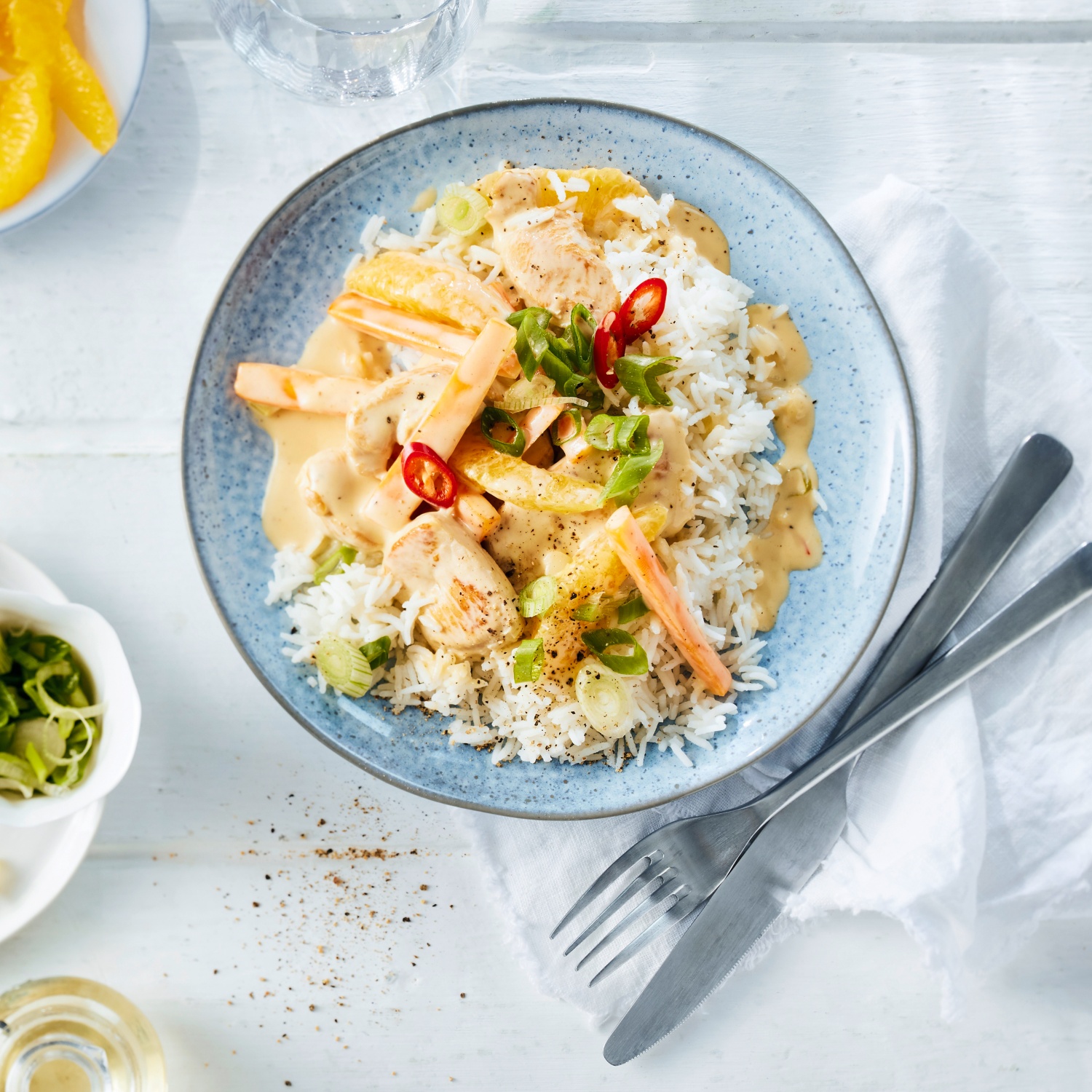 - Die Schale und die weiße Haut von zwei Orangen mit dem Messer entfernen und filetieren. Die dritte Orange auspressen. Karotten schälen und in feine Stifte schneiden. Lauchzwiebeln in feine Ringe schneiden. Knoblauch häuten und pressen. Die Chilischote entkernen und je nach Schärfe eine halbe oder ganze Schote fein schneiden.