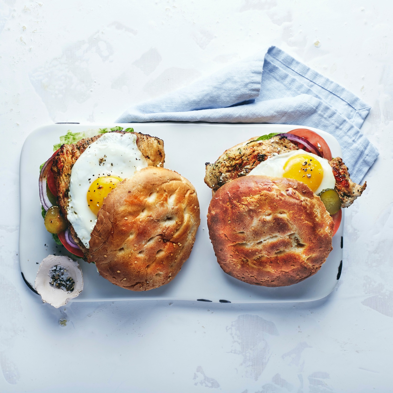 - Die Putensteaks auf die belegte Burgerhälfte legen und mit den Spiegeleiern toppen. Mit Salz und Pfeffer würzen. Mit der anderen Burger-Hälfte zuklappen.