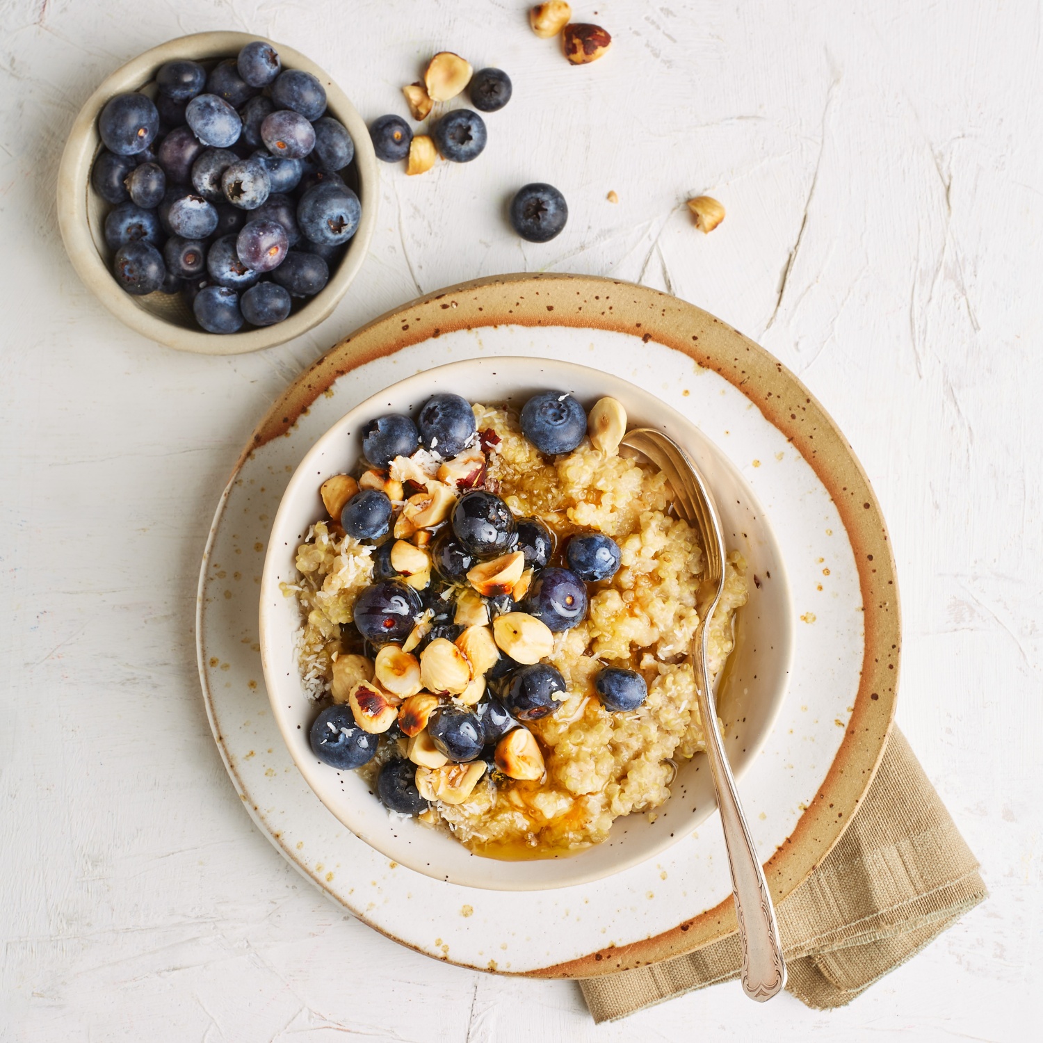 - Die Heidelbeeren waschen. Die Haselnüsse halbieren. Beides als Topping über das Quinoa-Frühstück streuen. Nach Belieben noch etwas Agavendicksaft darüber träufeln lassen und mit jeweils 1 TL Kokosraspel bestreut servieren.