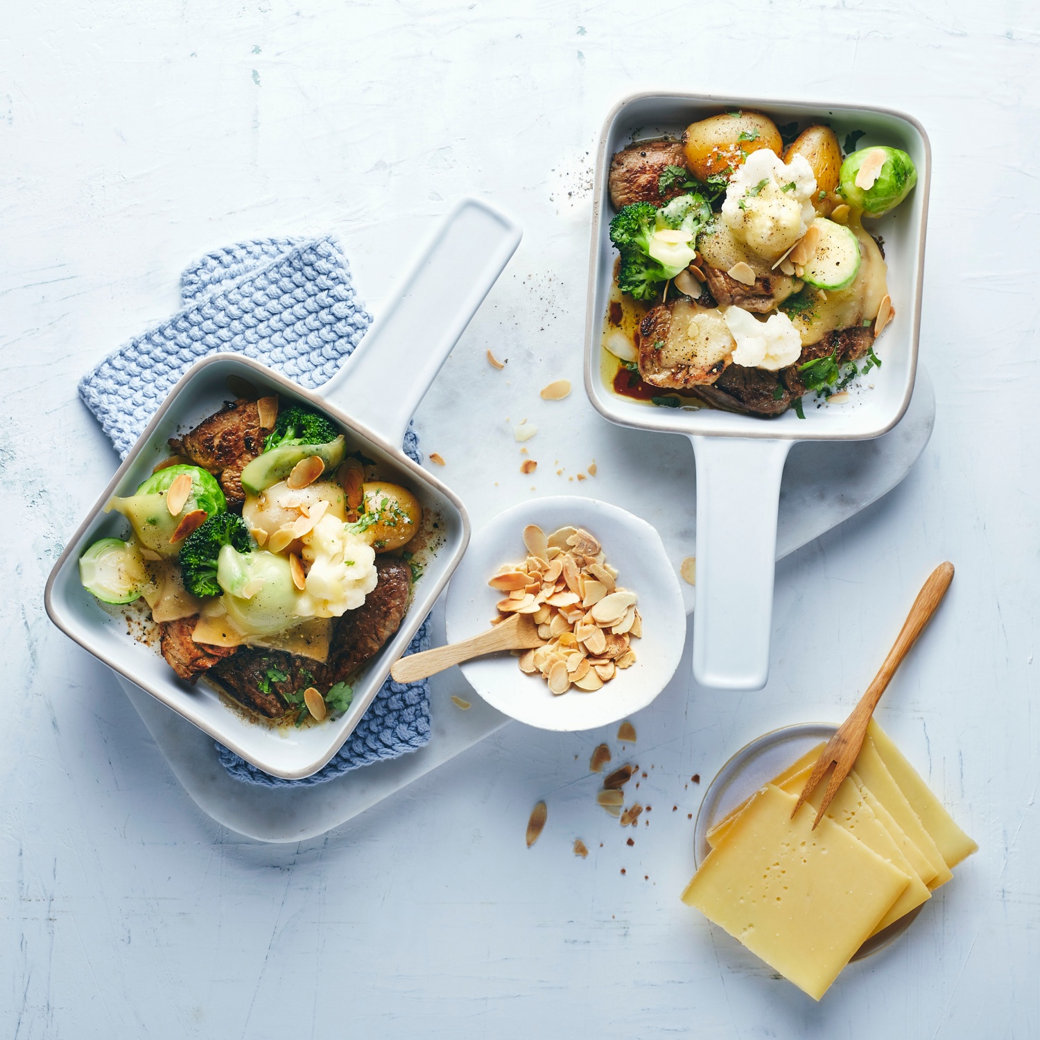 - Den Raclette-Grill vorheizen und nach Belieben das Fleisch grillen, mit Salz und Pfeffer würzen. Den Kohl auf die Pfännchen verteilen, mit einigen Mandelblättchen bestreuen und mit dem Raclette-Käse überbacken. Dazu die Kartoffeln servieren.