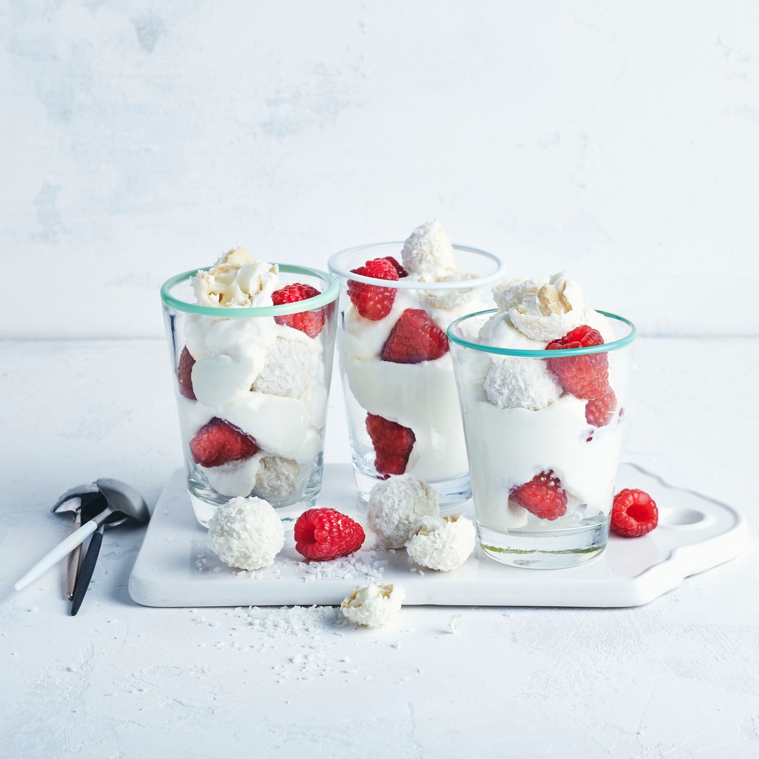 Die Himbeeren verlesen. Den Sahnequark, die Himbeeren und je 3 Raffaellos in die Dessertgläser schichten.
