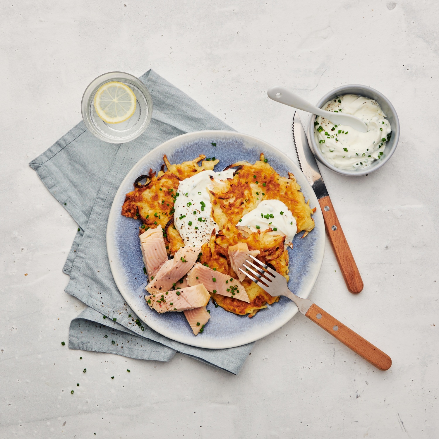 4. Die Räucherforelle in Stücke teilen. Mit den heißen Reibekuchen und dem Meerrettich-Quark servieren.