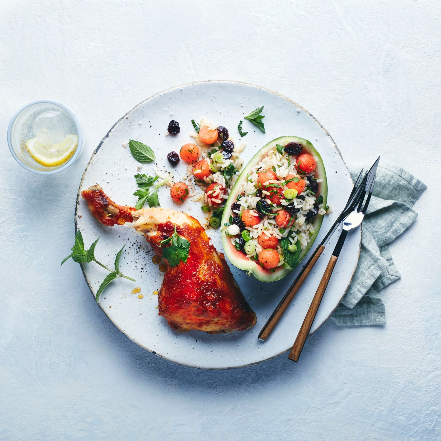 Fruchtig und herzhaft: erfrischende Melone mit Reissalat gefüllt, dazu würzige und kross gebackene Hähnchenschenkel - die leckerste Kombination, die der Sommer zu bieten hat! Zum Rezept