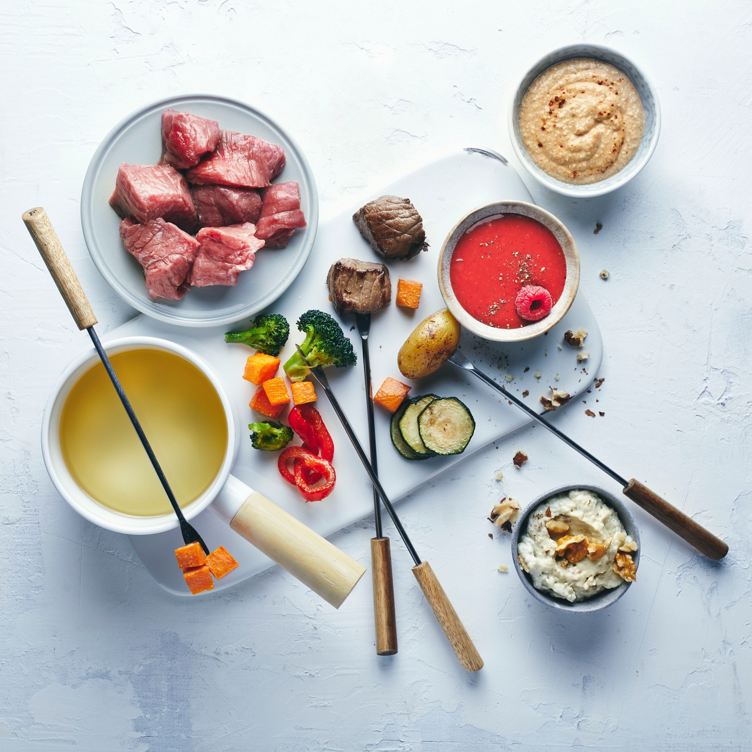 - Das Fleisch, das Gemüse und die Dips in kleine Schalen füllen und auf dem Tisch verteilen. Die Zutaten aufgespießt im siedenden Öl knusprig braten und mit einem Dip genießen.
