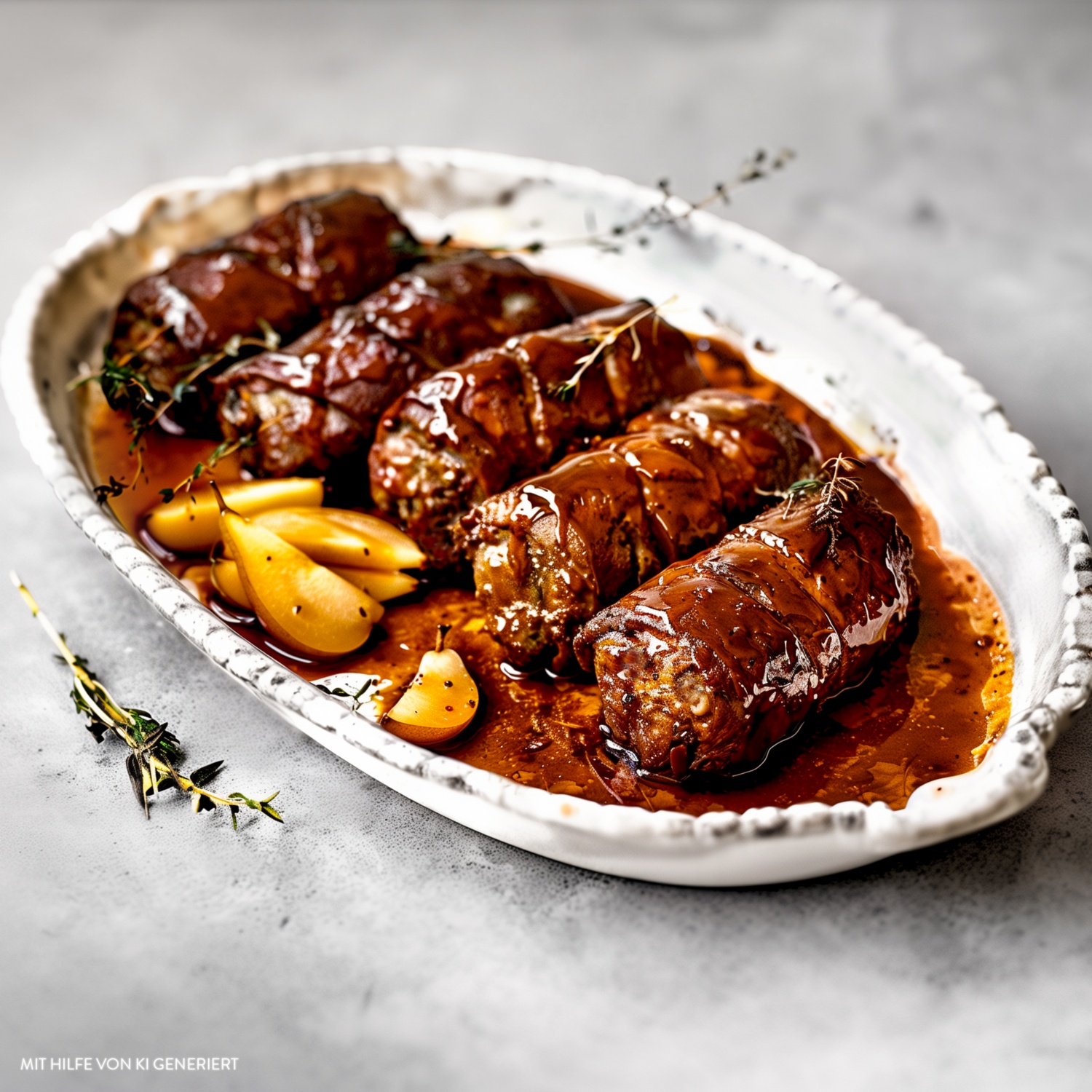 - Die Rouladen mit der Bratensauce servieren, nach Belieben mit weiteren Birnenspalten garnieren und mit frischen Kräutern, wie Thymian, dekorieren.