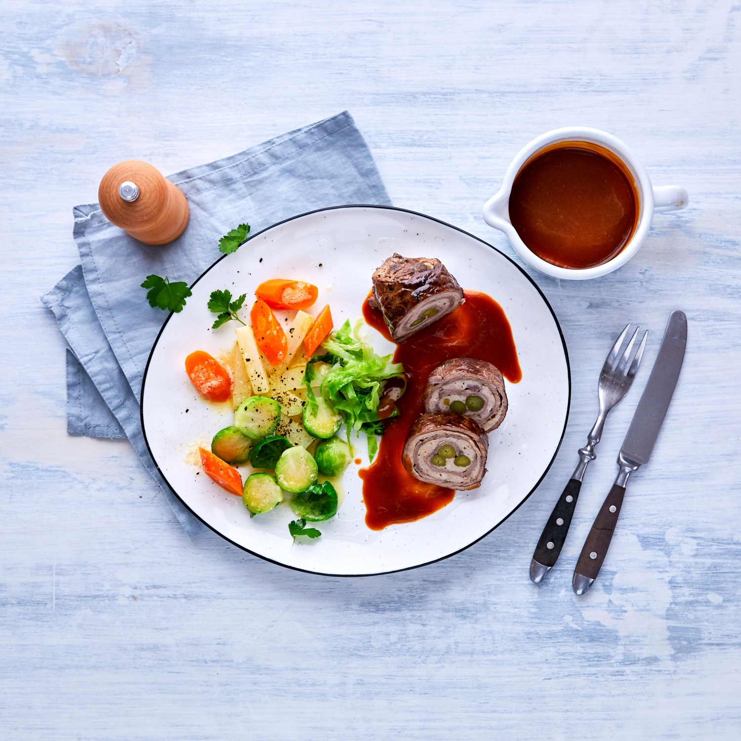 - Rouladen zusammen mit dem Gemüse und der Sauce anrichten. Nach Geschmack mit frischen Kräutern garnieren.
