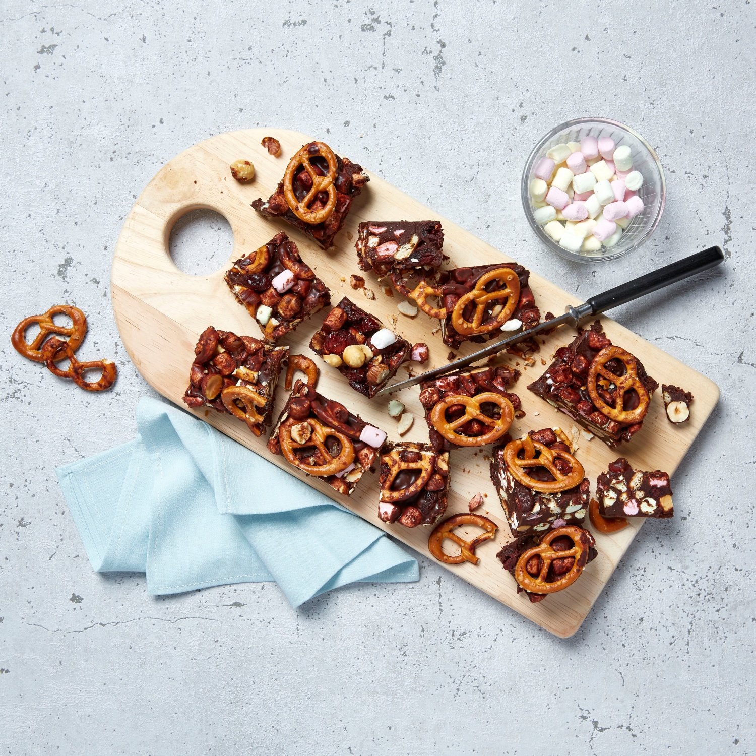 Salzig, süß und nussig: Die beliebte No-Bake-Schnitte Rocky Road überzeugt mit einer Mischung aus Salzbrezeln, Haselnüssen, Marshmallows und Cranberrys. Zum Rezept