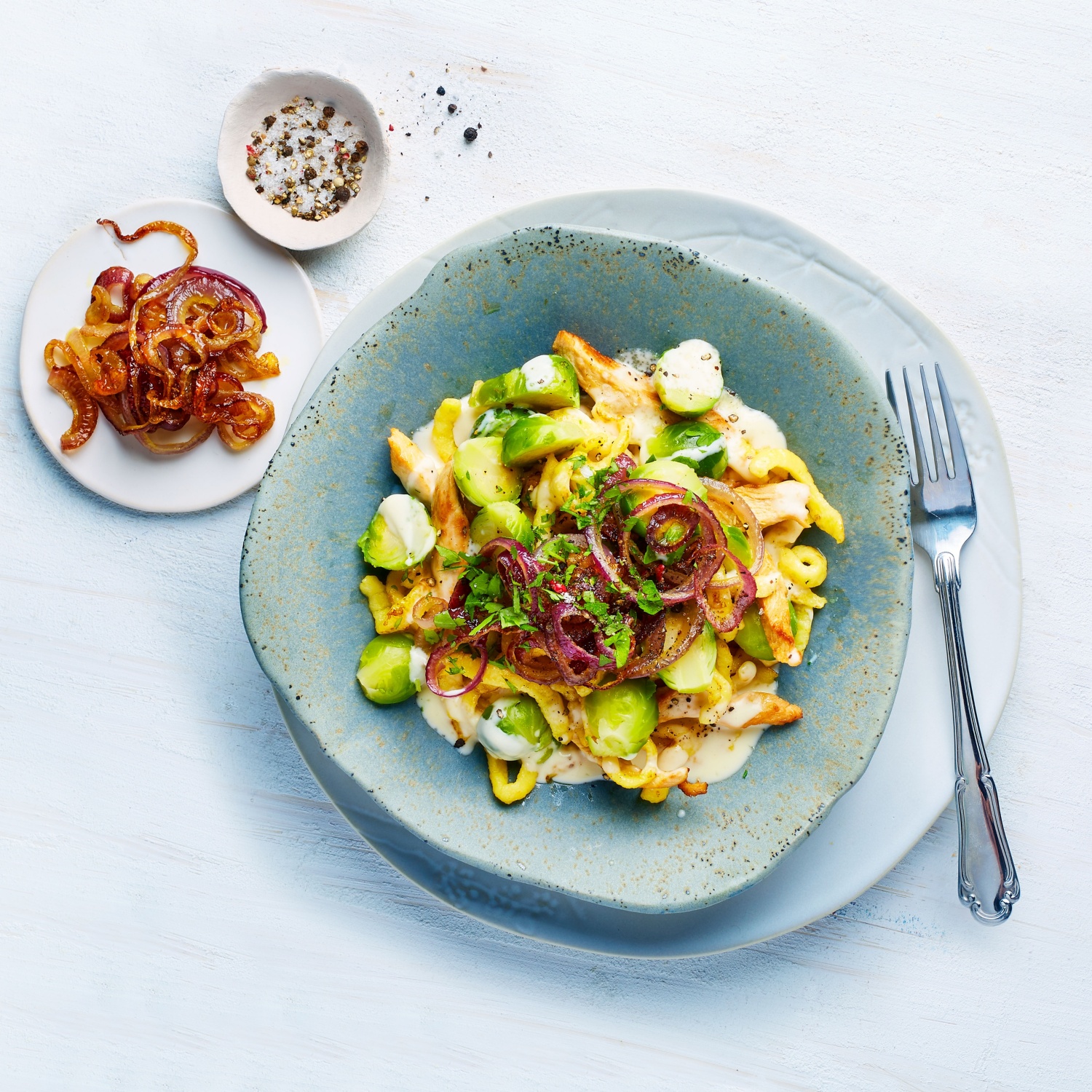 3. Mit Salz und Pfeffer würzen, aus der Pfanne nehmen und warm stellen. In die Anbratpfanne dann die Sahne geben und die Röststoffe mit einem Kochlöffel vom Boden lösen. Stärke mit Milch anrühren, Sahne in der Pfanne aufkochen und mit der Stärke binden. Alles 2-3 Minuten köcheln lassen und mit Salz, Pfeffer und Muskatnuss abschmecken. Angebratenes Fleisch (mit dem Fleischsaft), Rosenkohl und Spätzle in die abgebundene Sahne geben, 3-4 Minuten darin erhitzen und mit den angebratenen Zwiebelringen und Petersilie bestreut servieren.