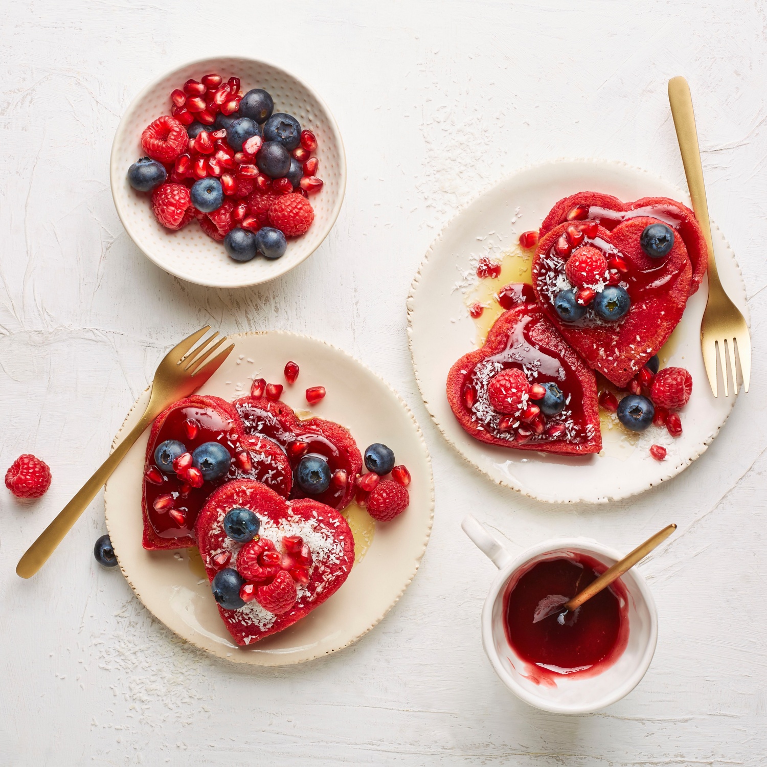 Ein herziger Gruß aus der Küche. Süße Rote-Bete-Pancakes für das Valentinstags-Frühstück. Zum Rezept