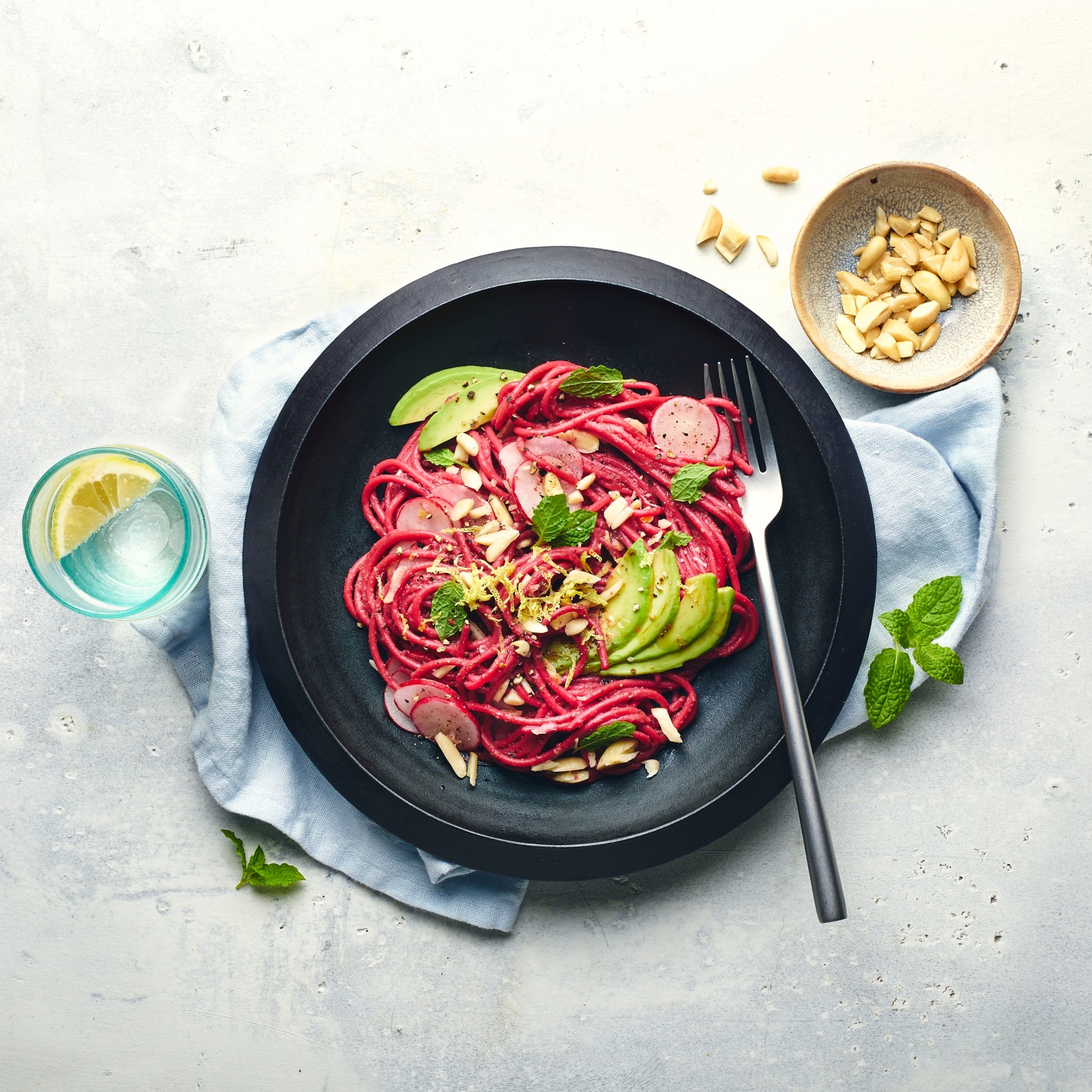 Rote-Bete-Pasta mit Minz-Mandel-Pesto