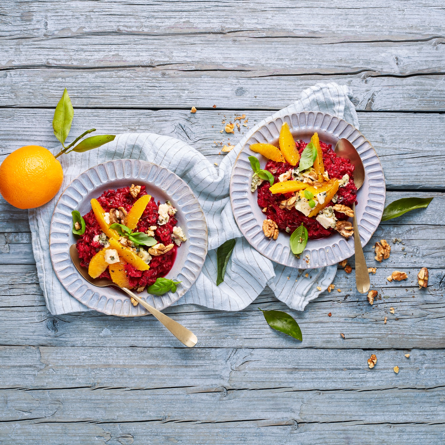 - Den Käse grob zerpflücken und zusammen mit den Orangen und den Walnüssen auf das angerichtete Rote Bete Risotto geben. Mit frischem Basilikum garnieren.