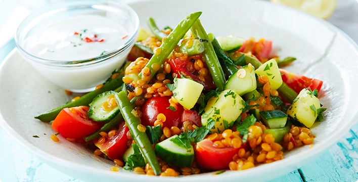 6. Den Linsensalat anrichten und die Joghurtsauce separat dazu reichen.
