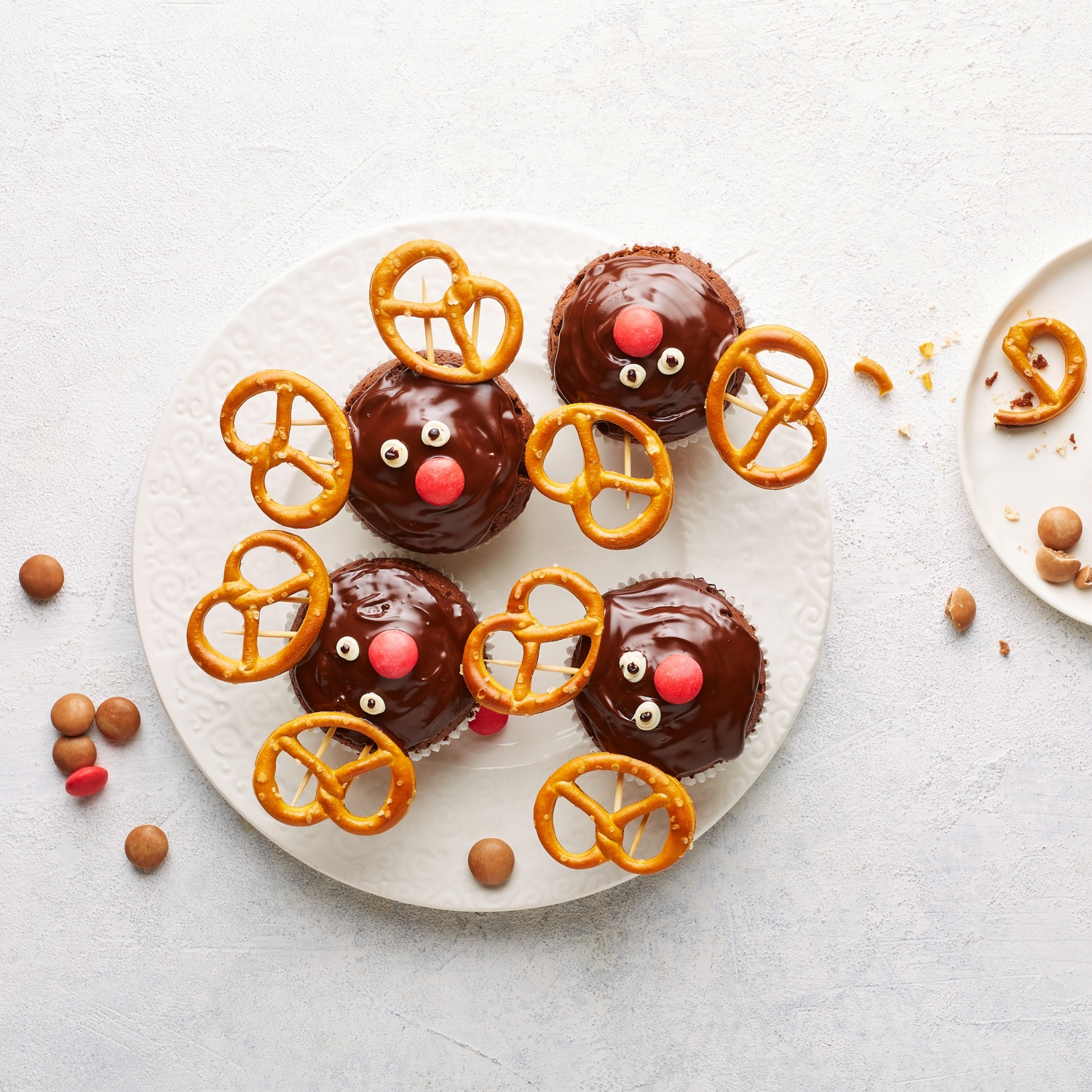 - Die Muffins sollten vollständig erkaltet sein, bevor Sie mit der Verzierung beginnen. Schmelzen Sie den Schokoladenguss nach Packungsanleitung und glasieren Sie die Muffins. Platzieren Sie die roten Smarties in der Mitte der Muffins, solange der Guss noch feucht ist. Drücken Sie jeweils zwei Brezeln oben als Geweih in die Muffins - hierbei ist ein bisschen Fingerspitzengefühl gefragt, damit die Brezeln nicht zerbrechen. In gut sortierten Supermärkten finden Sie auch Schokobrezeln im Backbedarf - selbstverständlich können Sie auch die süße Variante verwenden. Puderzucker in eine Schüssel geben und langsam Wasser einfließen lassen. Dabei mit einem Schneebesen solange rühren bis eine glatte Masse entsteht. Geben Sie auf den festen und erkalteten Schokoladenguss nun jeweils zwei Tropfen weißen Zuckerguss mit ca. 1 cm Durchmesser als Augen auf. Erst wenn dieser getrocknet ist, geben Sie mit brauner Zuckerschrift zwei kleine Tropfen als Pupillen in die Mitte der Augen.