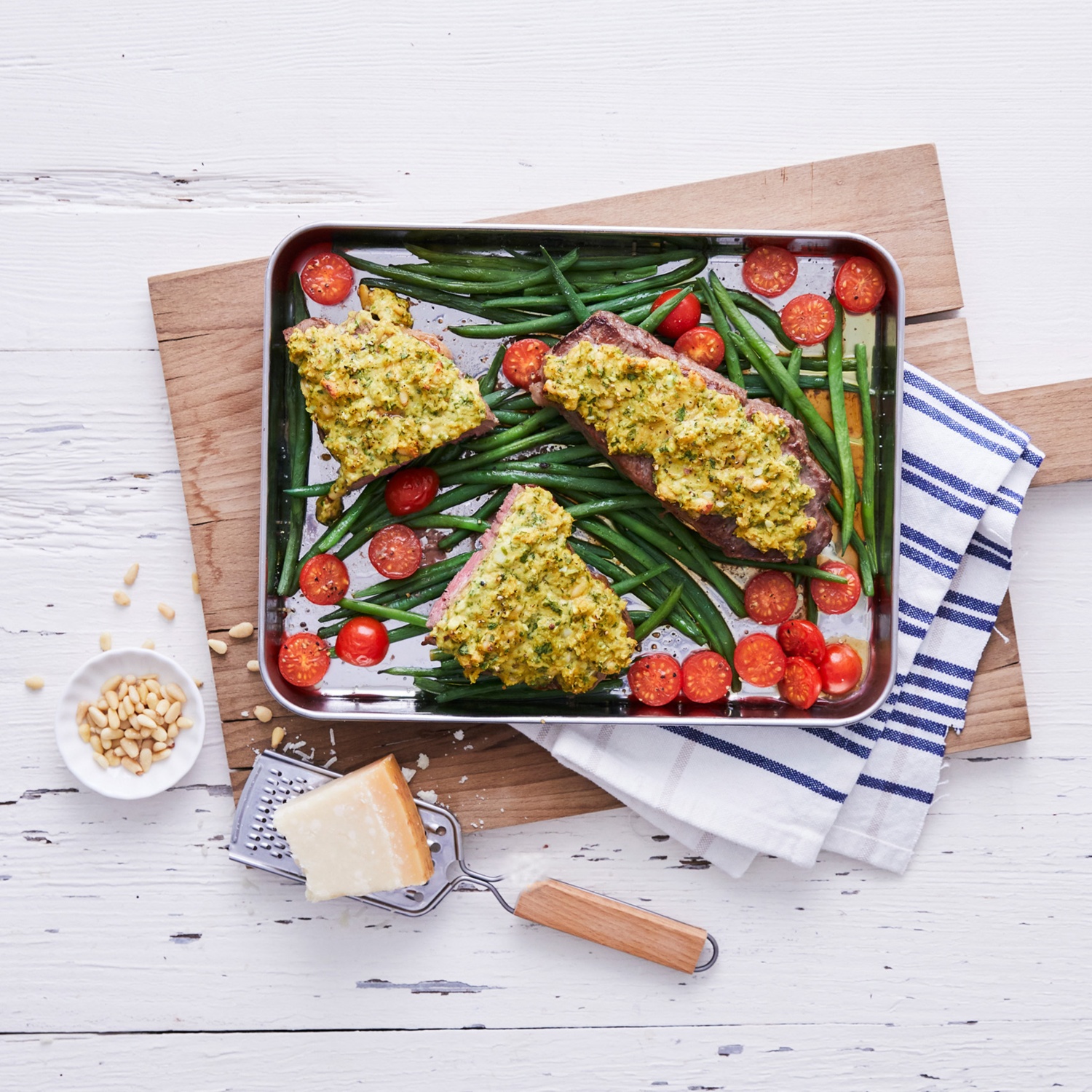 Rumpsteak mit Kräuterkruste und Bohnen vom Blech