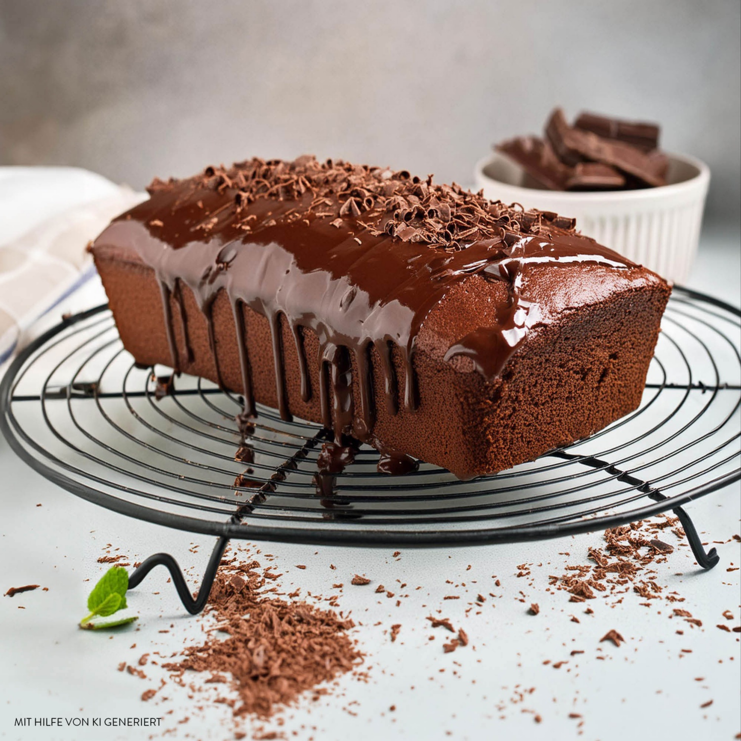 - 150 g Edel-Bitterschokolade klein hacken und mit der Butter in einem kleinen Topf im Wasserbad bei schwacher Hitze geschmeidig rühren. Den Kuchen damit bestreichen. Die restliche Edel-Bitterschokolade mit einem Sparschäler in Späne hobeln und den Kuchen damit verzieren.