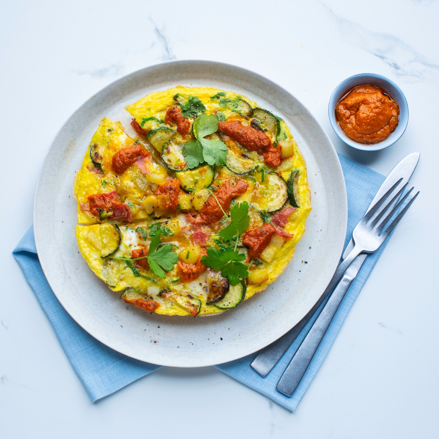 Ohne viel Aufwand, kommt die frisch duftende Salami-Kartoffel-Frittata aus dem Ofen. Serviert wird das leckere Gericht mit rotem Pesto. Zum Rezept