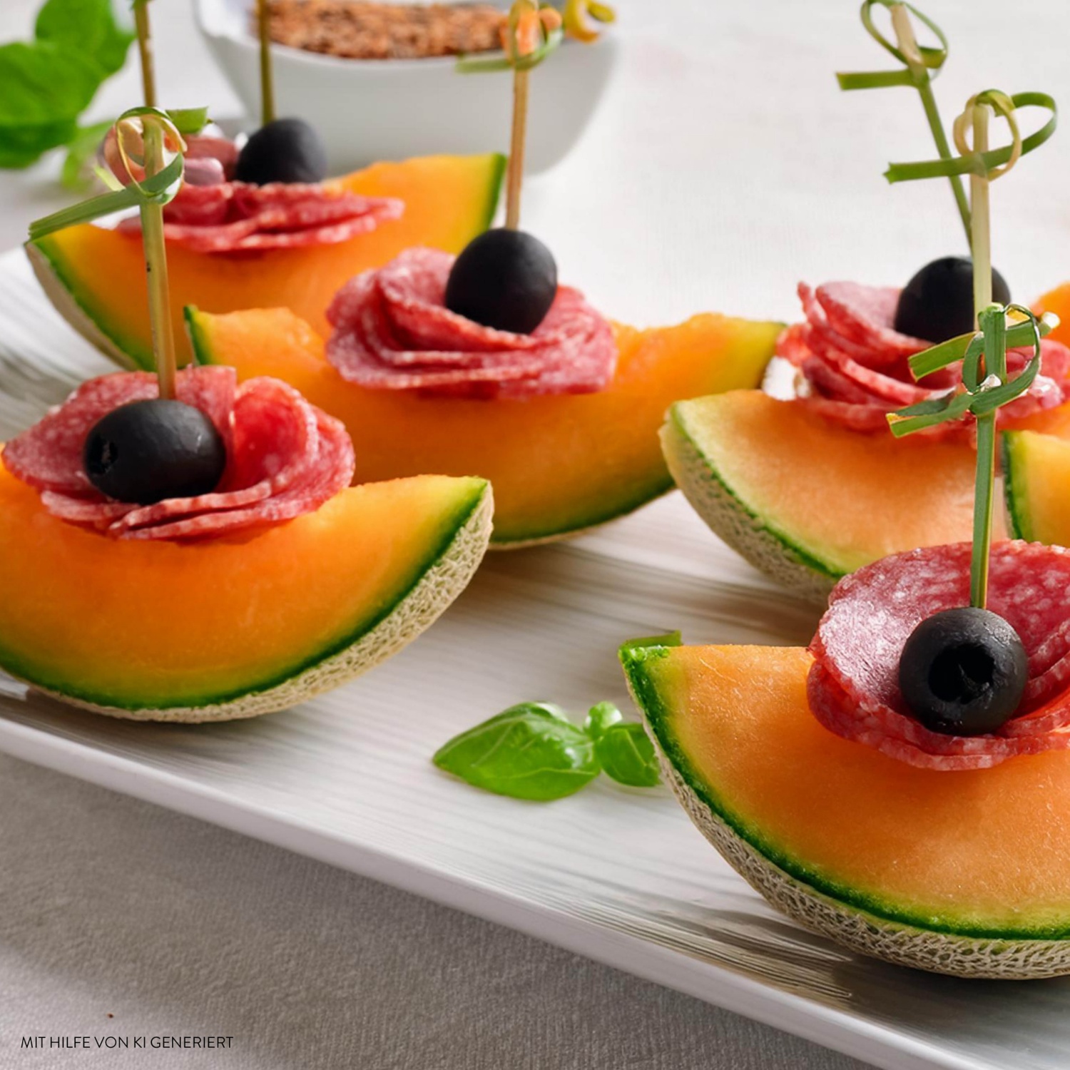 - Melone halbieren, entkernen und in Schiffchen schneiden. Salamischeiben zu Blüten formen. Eine Olive auf einen Zahnstocher stecken. Damit die Salamiblumen auf den Melonenstücken fixieren. Mit Pfeffer bestreuen und mit Basilikumblättern verzieren.