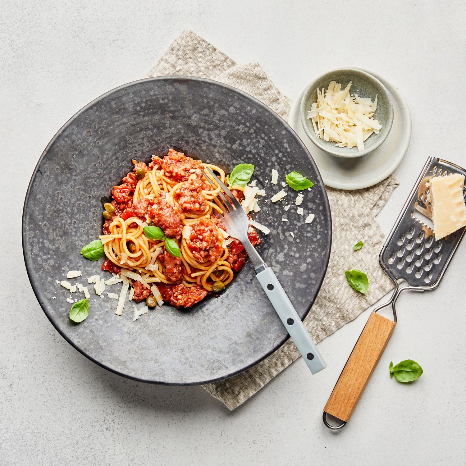 Salsiccia-Spaghetti mit Tomaten-Kapern-Sauce