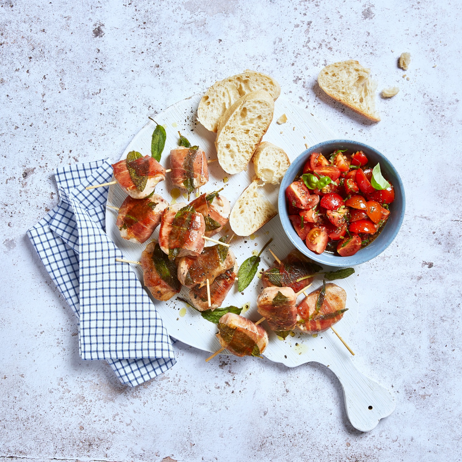 - Die Saltimbocca-Spieße mit der Tomatensalsa und frischem Baguette servieren.