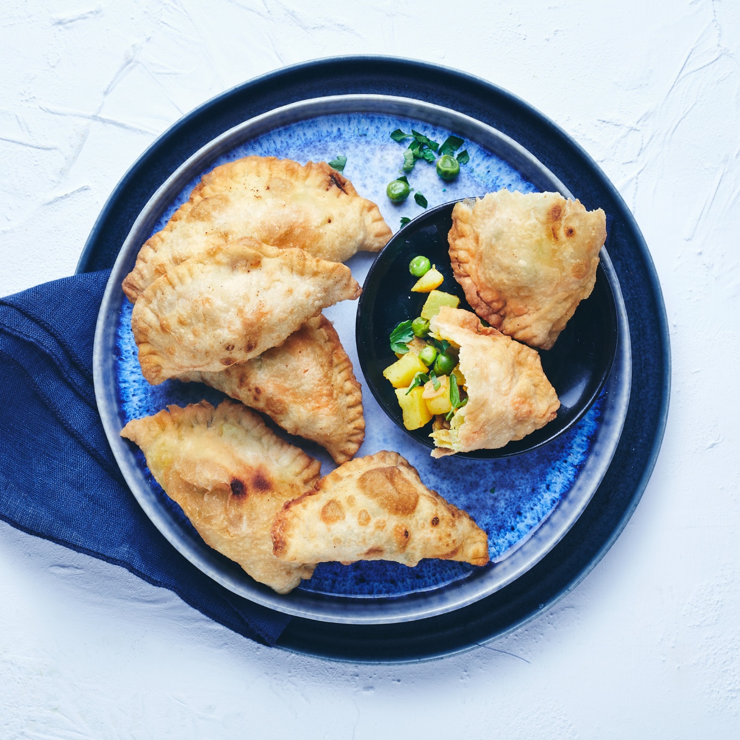 - Den Teig in 12 Portionen teilen und zu Kugeln formen. Jede Kugel auf ca. 15-17 cm ausrollen. Die Füllung mit einem Esslöffel auf die Teigportionen verteilen und die Teigtaschen halbmondförmig zusammenklappen. Die Ränder (am besten mit einer Gabel) gut festdrücken. Die Samosas in reichlich heißem Öl goldbraun ausbacken.