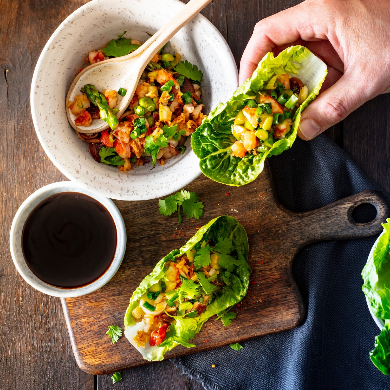 - Äußere Blätter der Salatherzen abzupfen, waschen und trocken schütteln. Zum Anrichten das Salatblatt zunächst mit etwas Hoisinsauce bestreichen und anschließend Garnelenfüllung darauf verteilen. Zum Schluss mit einigen Röstzwiebeln bestreuen und servieren.
