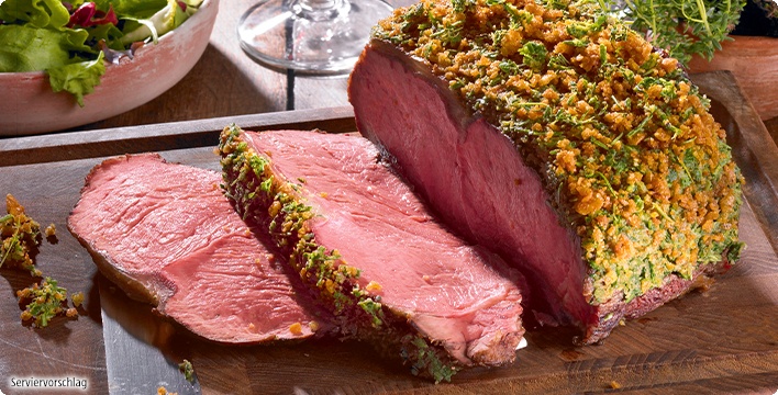 Sanft gegartes Roastbeef mit einer Kräuter-Senfkruste