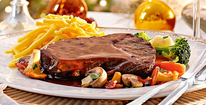 Sauerbraten mit Waldpilzen, Buttergemüse und Spätzle