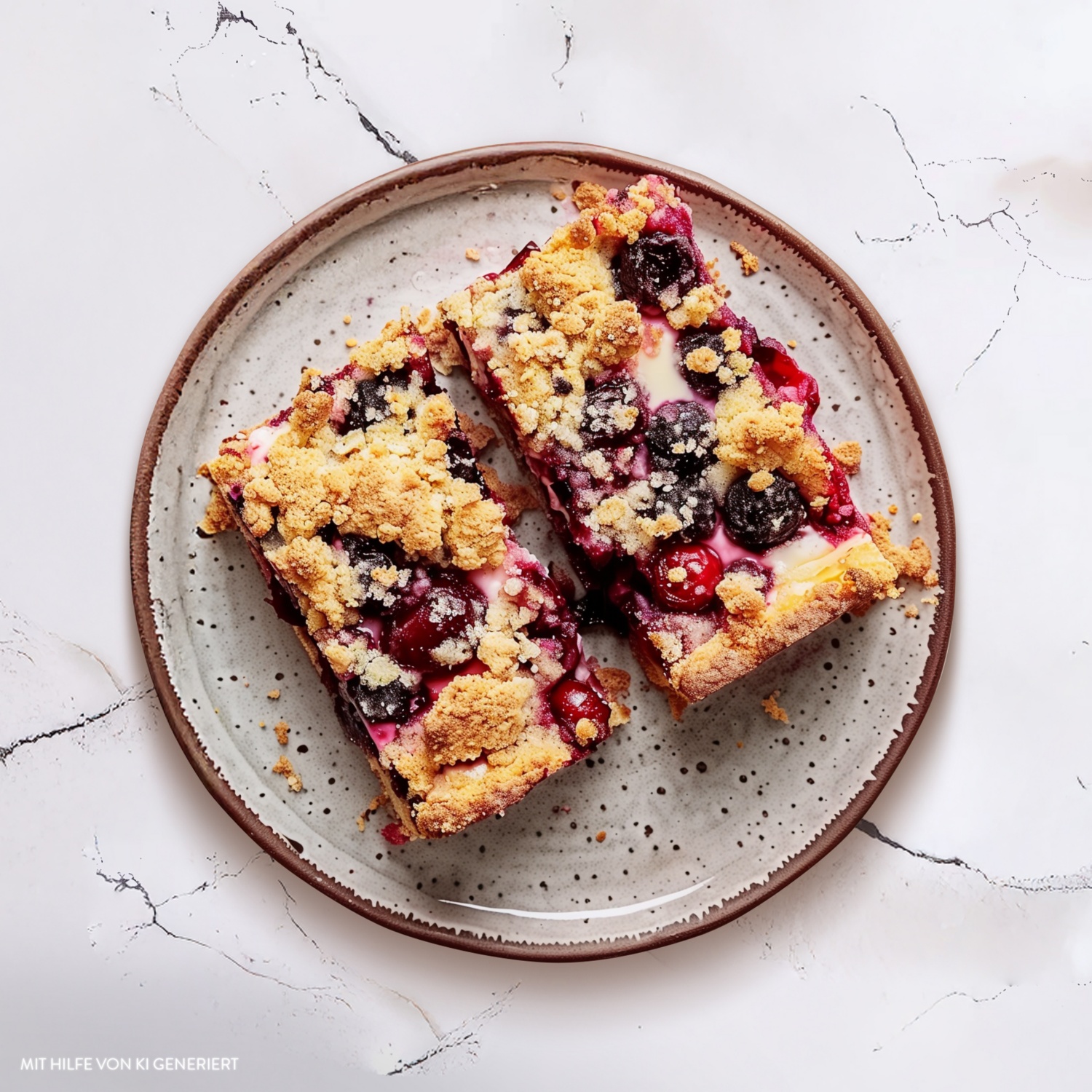 - Für die Streusel Mehl, Zucker und kalte Butter mit den Händen oder einem Mixer zu einem krümeligen Teig verkneten. Die Streusel gleichmäßig über die Kirschen streuen.