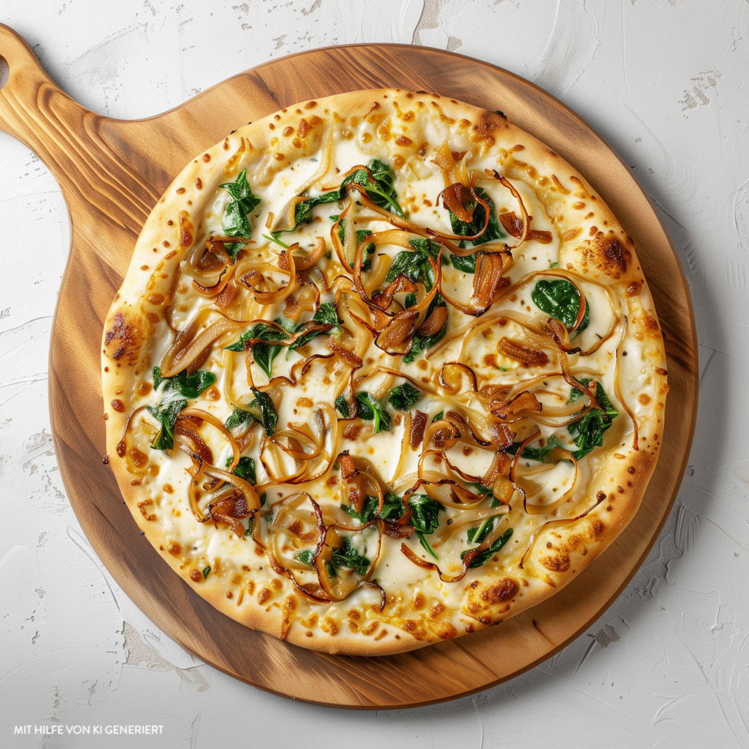 Knuspriger Sauerteig-Pizzaboden, belegt mit cremigem Käse, süßen karamellisierten Zwiebeln und frischem Spinat. Zum Rezept