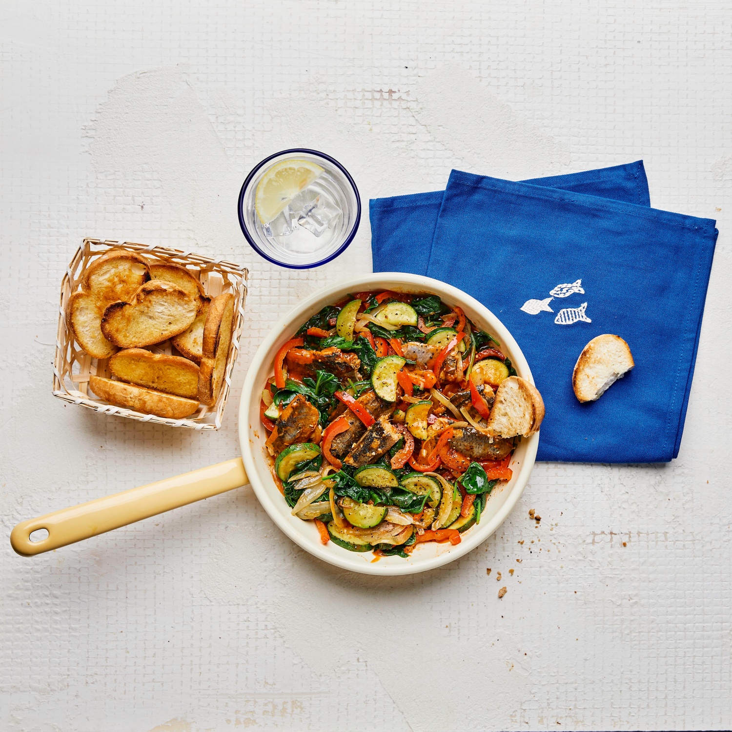 Die schnelle Fischpfanne mit gerösteten Baguettescheiben servieren.