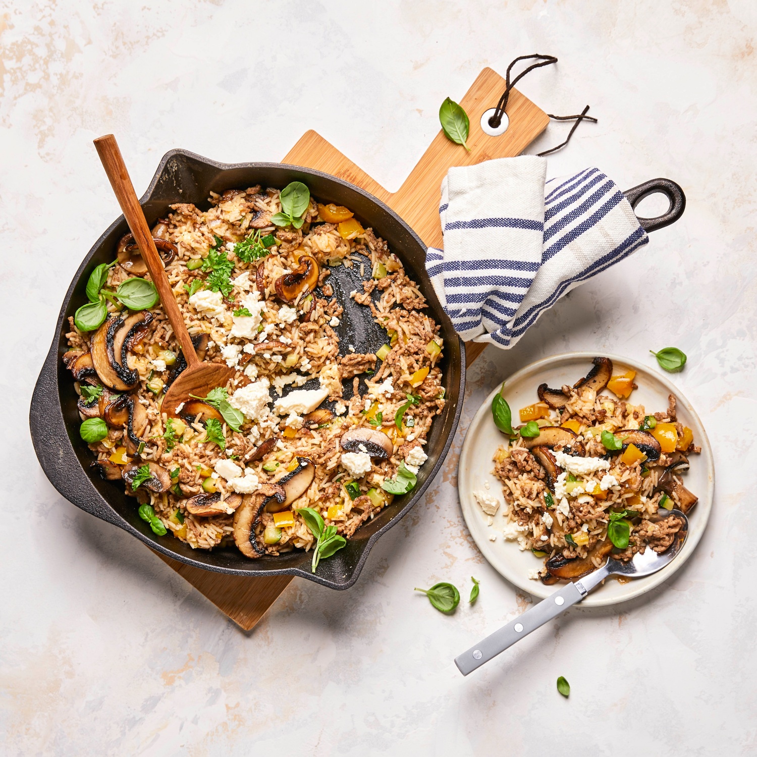 - Den Feta zerbröseln und in die Hackpfanne rühren, bis er leicht geschmolzen ist. Das Gericht mit Salz, Pfeffer, Paprikapulver und den Kräutern abschmecken.