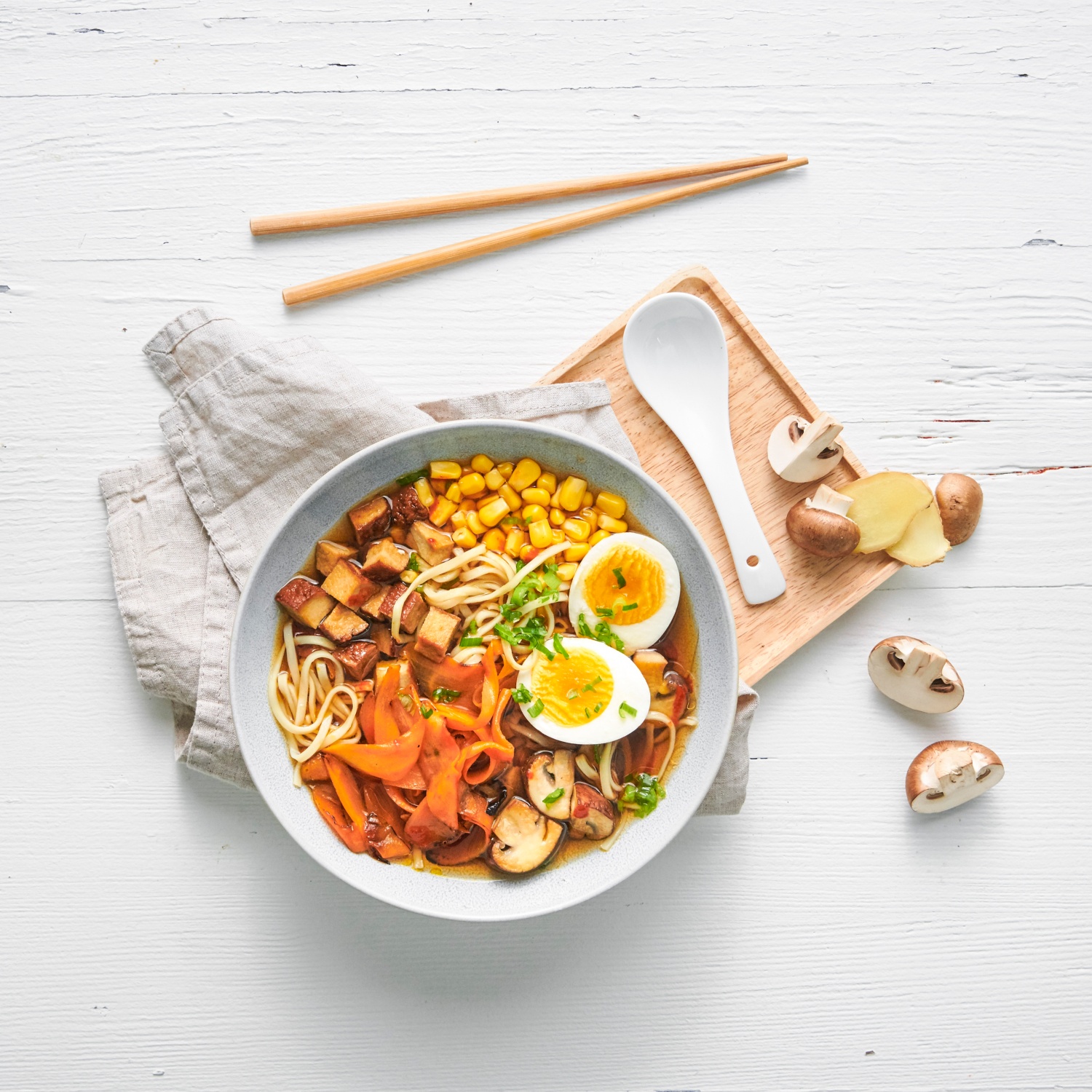 - Die Nudeln nach Packungsanweisung zubereiten und auf vier große Suppenschalen aufteilen. Die Brühe darüber geben. Die Toppings, Möhrenstreifen, Pilze, Tofu und den Mais, nebeneinander in den Schalen anrichten. Die Eier pellen, halbieren und in die Suppe legen.
