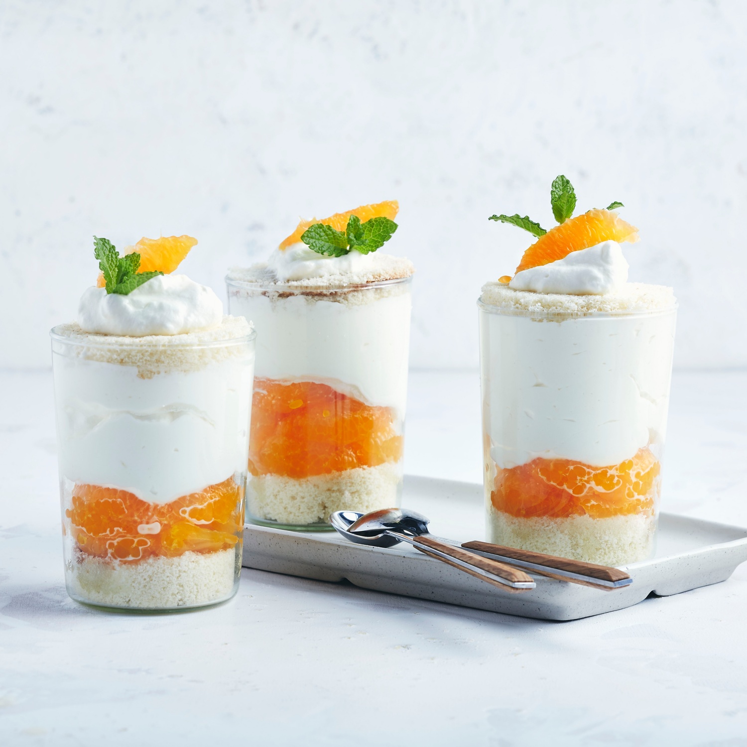 Unkompliziert, lecker und ohne Backen: Dieses schnelle Käsekuchen-Dessert aus dem Glas ist blitzschnell fertig – Biskuitteig, Schlagsahne und Mandarinen schichten und loslöffeln. Zum Rezept