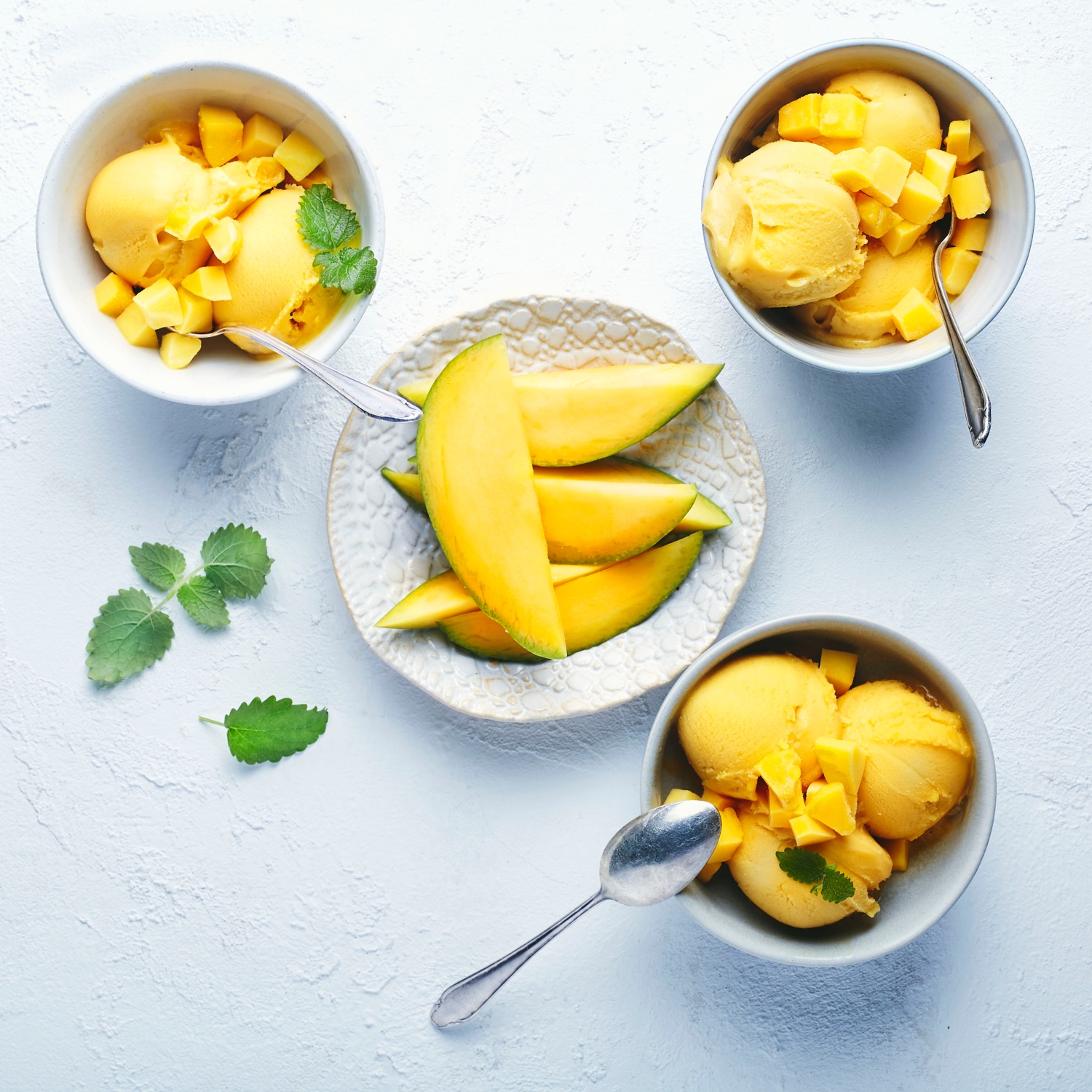 Mango schälen und das Fruchtfleisch in kleine Würfel schneiden. Mangowürfel auf einem kleinen Blech oder Teller ausbreiten, mit Frischhaltefolie abdecken und im Gefrierfach tiefgefrieren.